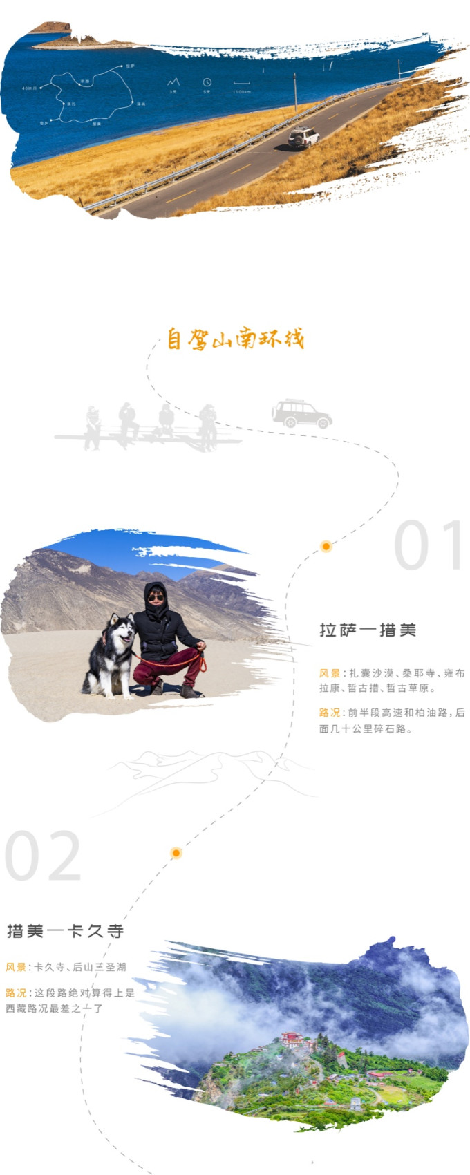 这次路线设计,不走回头路,且将山南之精华尽收眼底。雪山、神湖、草原、冰川、温泉、古寺、藏地文化,看点多元且丰富,路途不乏味。