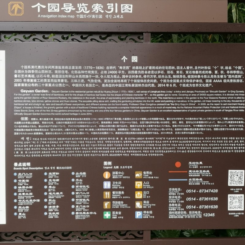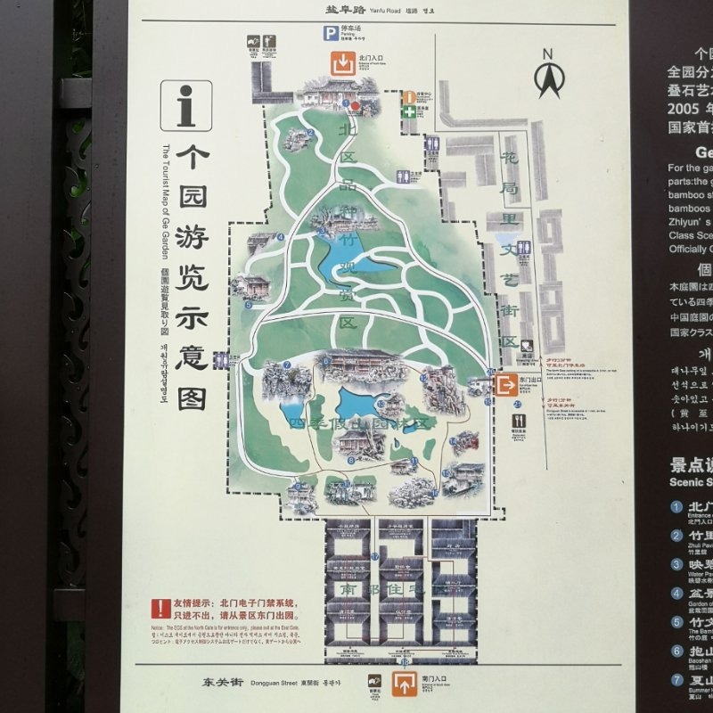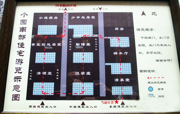 个园南门在东关街上,进去就是住宅区,游完,往北走,游花园、竹林,最后,从东门出来。