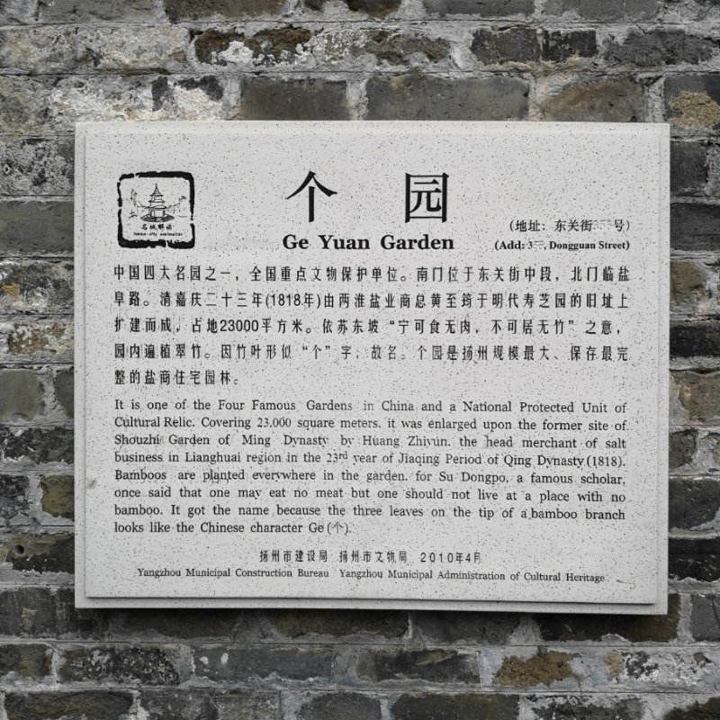 个园是两淮盐业商总黄至筠的私人园林。园名取自苏东坡“宁可食无肉,不可居无竹”之名句。又因竹字可拆成“个”字而名。