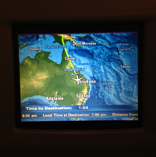 看了部<007, Skyfall>, 睡了一大觉,吃完早饭再看航行距离,飞机已经经过凯恩斯 、布里斯班 上空,马上就要到悉尼 啦!!