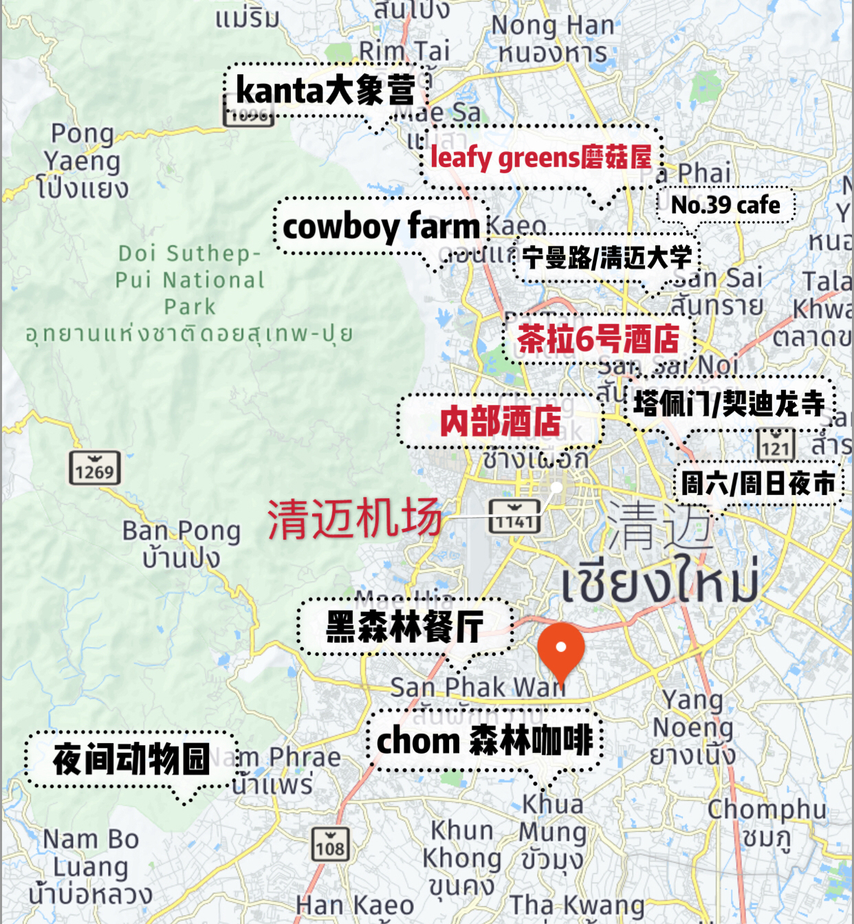 从地图上看得出,清迈机场位于正中央,也靠近市区附近,机场到古城地区仅需20分钟。