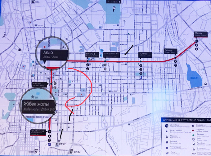从山顶下来,我们选择坐地铁过去(Abay→Znibek zholy,两个站)80坚戈/人