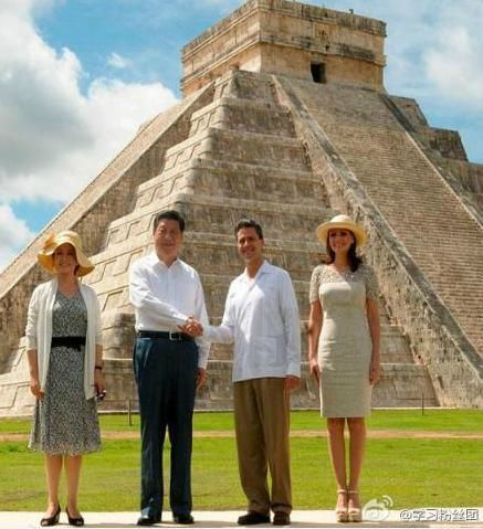 奇琴伊察 古城建于西元七至十世纪,具玛雅文化特色,有金字塔神庙、柱厅殿堂等,以石雕刻装饰为主。与夫人彭丽媛在墨西哥 总统涅托夫妇的陪同下一起参观,夫妇也入乡随俗,接受了为他们预备的洁净仪式。