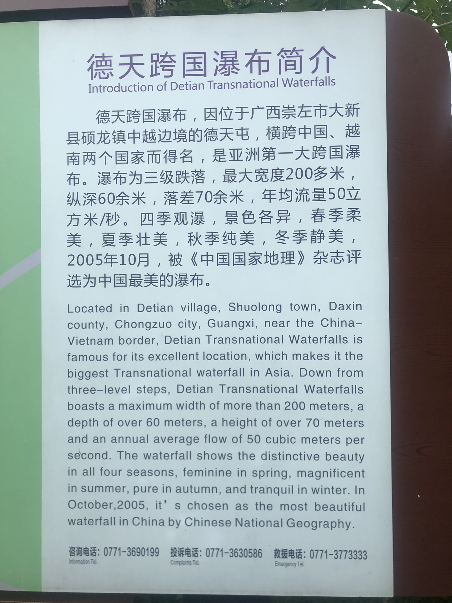 瀑布三级跌落,最大宽度200多米,纵深60多米,落差70余米,年均流量50立方米/秒,所在地地质为厚层状白云岩。是东南亚最大的天然瀑布,被国家定为特级景点。它与越南的板约瀑布连为一体,就像一对亲密的姐妹。