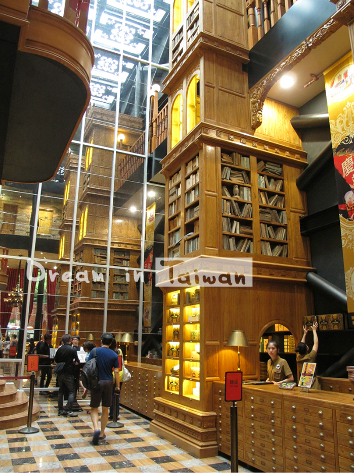 骤一看以为自己走进一个偌大的图书馆,因为店内高十多米的书架由地下摆放至天花板,仔细看书柜上的并非真的书本,而是各种糕点、饼干,以日式怀旧的盒子盛着,精美绝伦。店内共分为7个区域:宫原眼科 冰淇淋、宫原珍奶、日出土凤梨酥、日出喜饼、宫原巧克力以及中式酒家醉月楼和摘月楼。