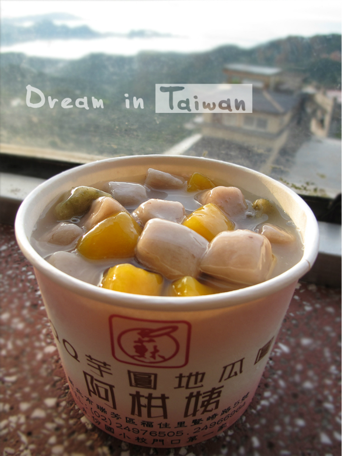 位于九份老街 的最高处,进门处买过后一路参观着他们的制作工坊往里走,七拐八拐到座位处,有专门的观景窗台。他家品种不多,就是简简单单的芋圆+综合豆(红豆绿豆芸豆)浇炼乳,芋圆口感超Q,加了炼乳连冰都变成奶味,最后喝了个底儿朝天。九份老街 的店面晚上七点前就关门,这家却营业到很晚,我们晚上八点多散步过来见没打烊果断再来一碗,店里没了白天的爆满,坐在窗边一边赏九份 夜景,一边吃美味的芋圆,着实一种享受。