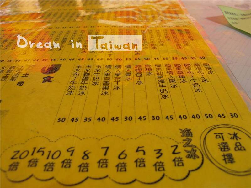 夜市、小吃到此为止,时间有限只品尝了这些,下面继续“吃”的话题,说一说台湾 的甜品、冰品。台湾 各城市都有很多甜品店、咖啡馆、冷饮店,尤其是台北 、台中 、高雄 。全台连锁的街边店有50岚、青玉、台茶一号、沏茶小铺、鹿儿角…台湾 饮料通常五种甜度:全糖、少糖、半塘、微糖、无糖,加冰分正常、少冰、碎冰、去冰,可根据个人爱好自行选择~感觉50岚比较多见,推荐他家的冰淇淋红茶,有的店是把冰淇淋放在杯底再倒红茶,而不是浮在最上面,冰淇淋化掉就一秒钟变冰奶茶,怎么喝都好喝。还有名字巨霸道的波霸奶茶,他家生意在哪都不会差,是本地人中比较受欢迎的。另推荐台中 静宜大学静宜会馆门口一家饮品店,他家兼卖早餐,鲜奶多酚无敌好喝,真真儿是直接用3小瓶多酚加鲜奶兑出来的,实在吖。夜市上的鲜榨果汁果奶之前都有提到不再赘述,只多提个人最喜欢的一款饮品鲜柠檬绿,吃完油腻腻的东西后来一杯格外清爽~