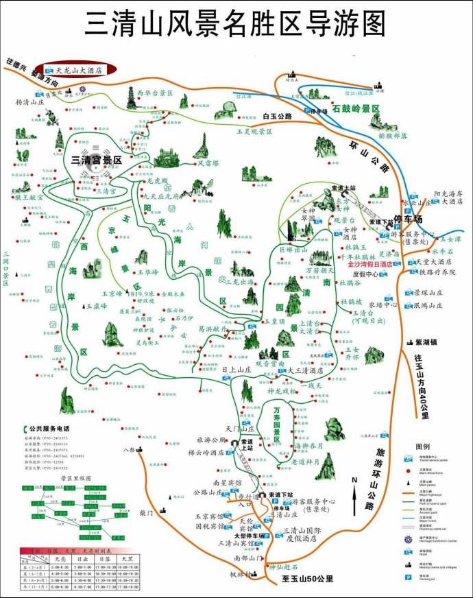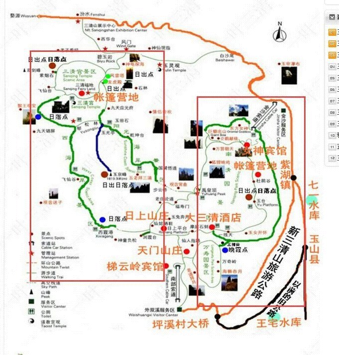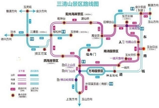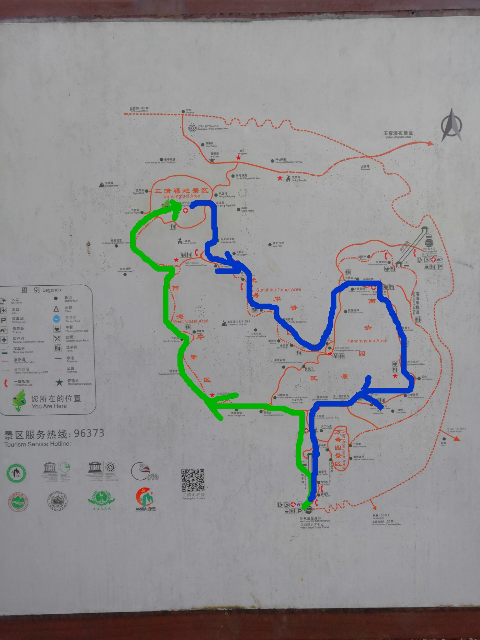 整个景区的游览线路呈一个8字型,南清园一个圈,观赏重点是各种奇形怪状的石头和山体,偏细节景色,东西海岸一个圈,观赏重点则是晚霞,云海,群山,偏宏观景色。还有一个三清宫和玉京峰可以划分到东西海岸景色圈里。以上两张地图虽然很详细,但不够清晰,而且都没有标出南海岸栈道。