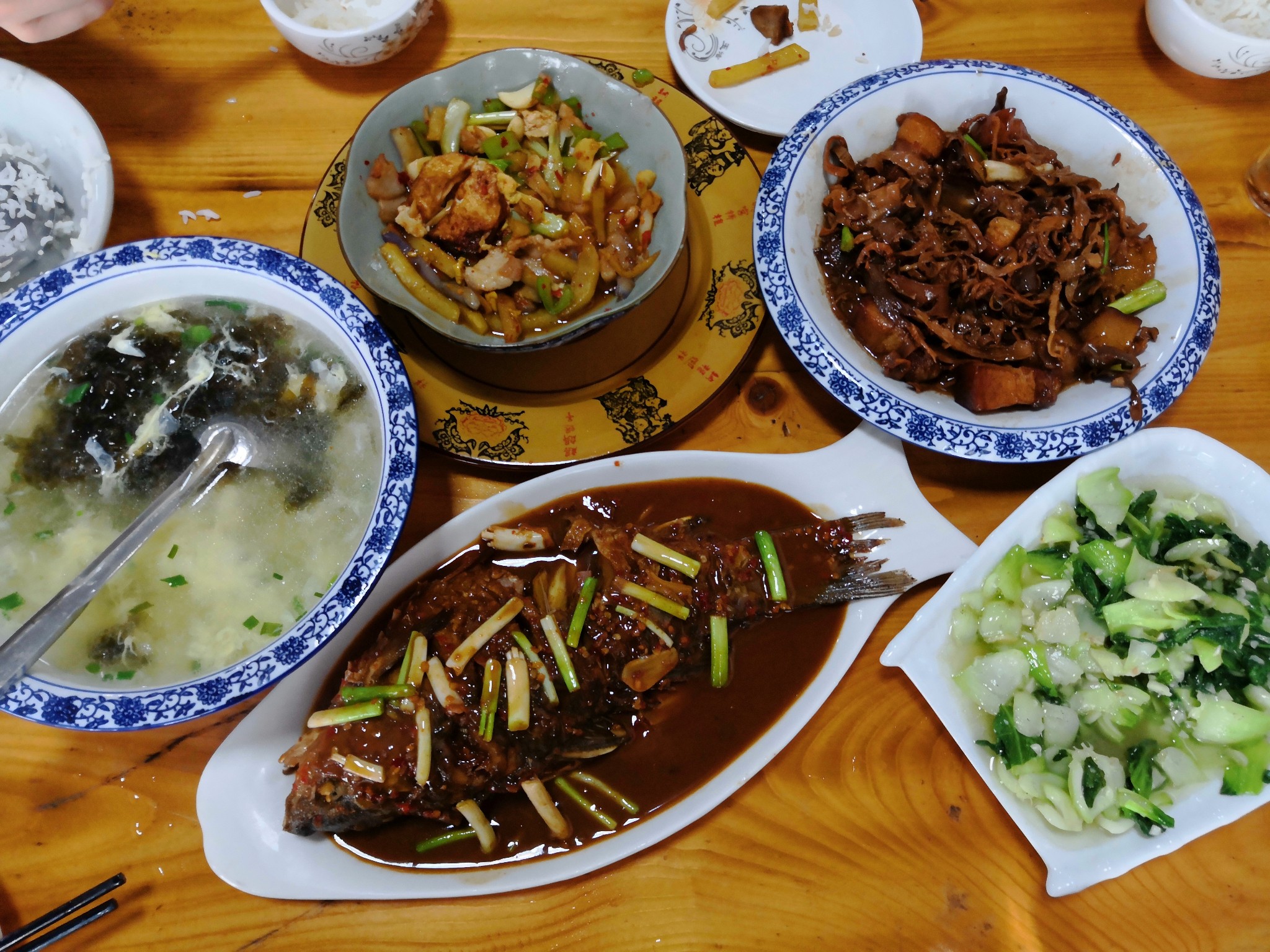 四菜一汤:红烧鲫鱼、笋干红烧肉、农家一碗香、青菜,紫菜蛋汤。这几个菜份量都很足,而且味道不错,一碗香最受欢迎,我们三个人都没吃完,最关键是在景区这个价真是很实惠!