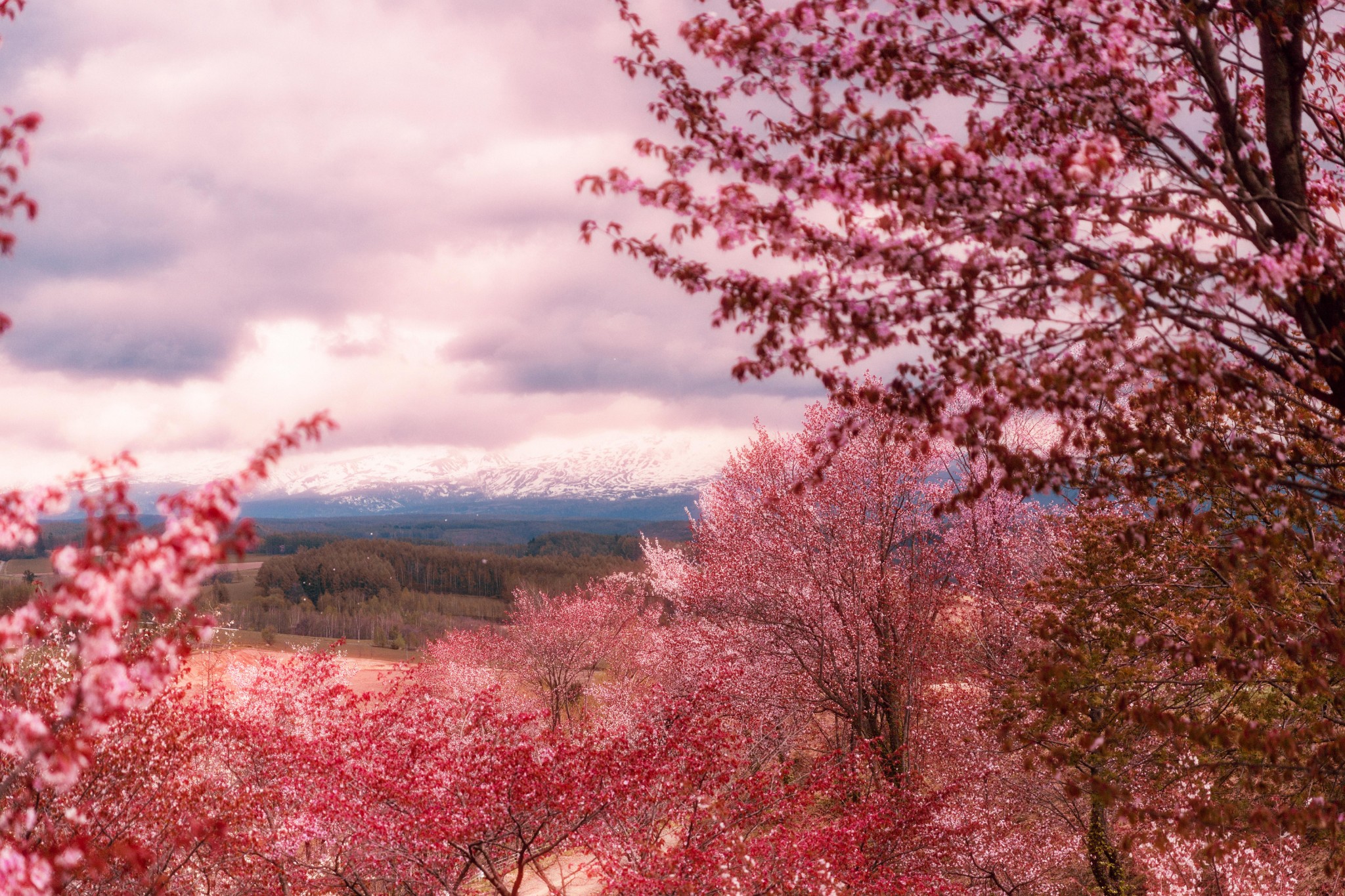 从这里瞭望可以看到白色的雪山,墨绿色的森林,暖色调的田野和粉嫩的樱花,不同的色调层次,绝对可以让你安静惬意得在这里坐上一整天。