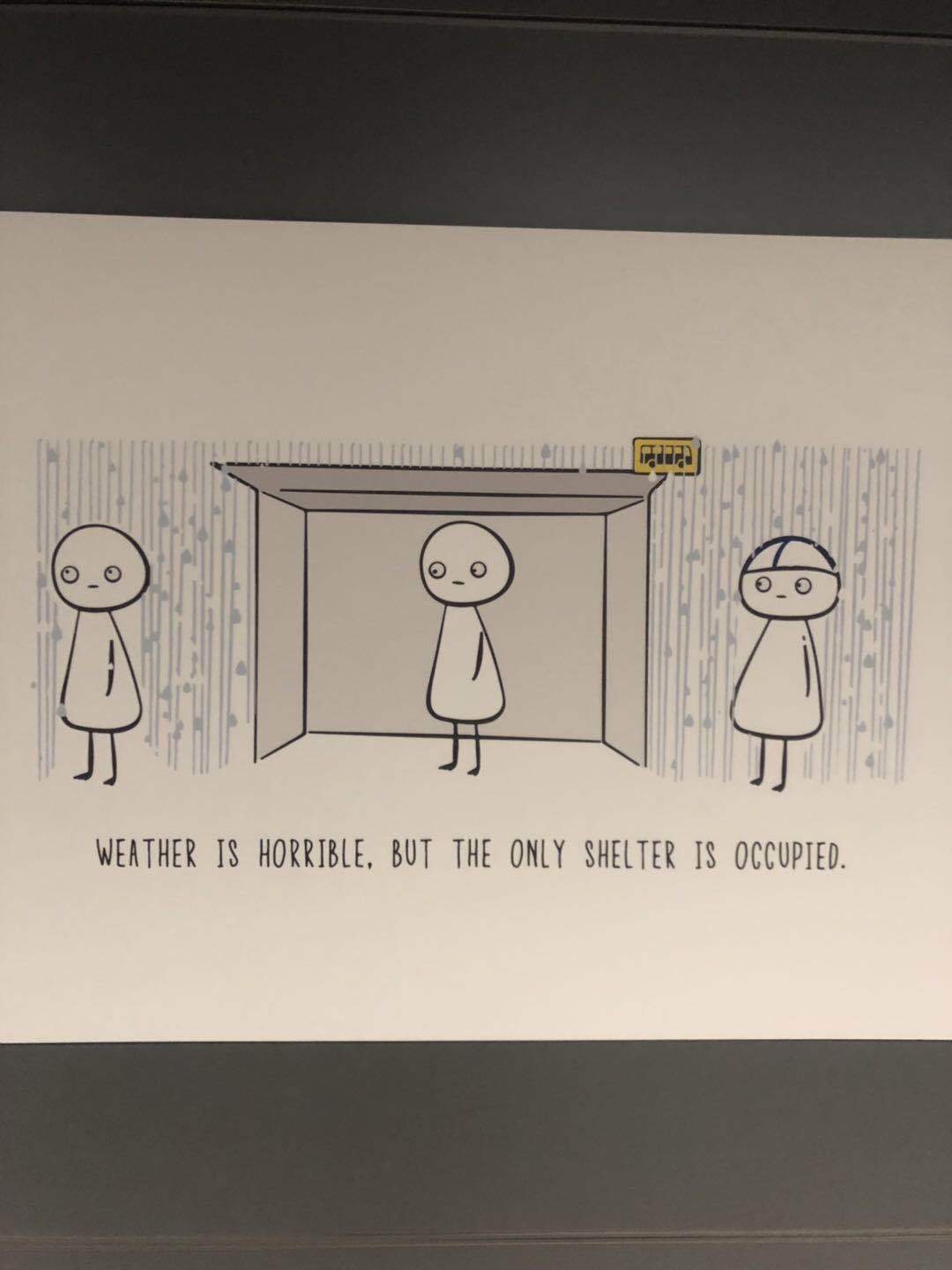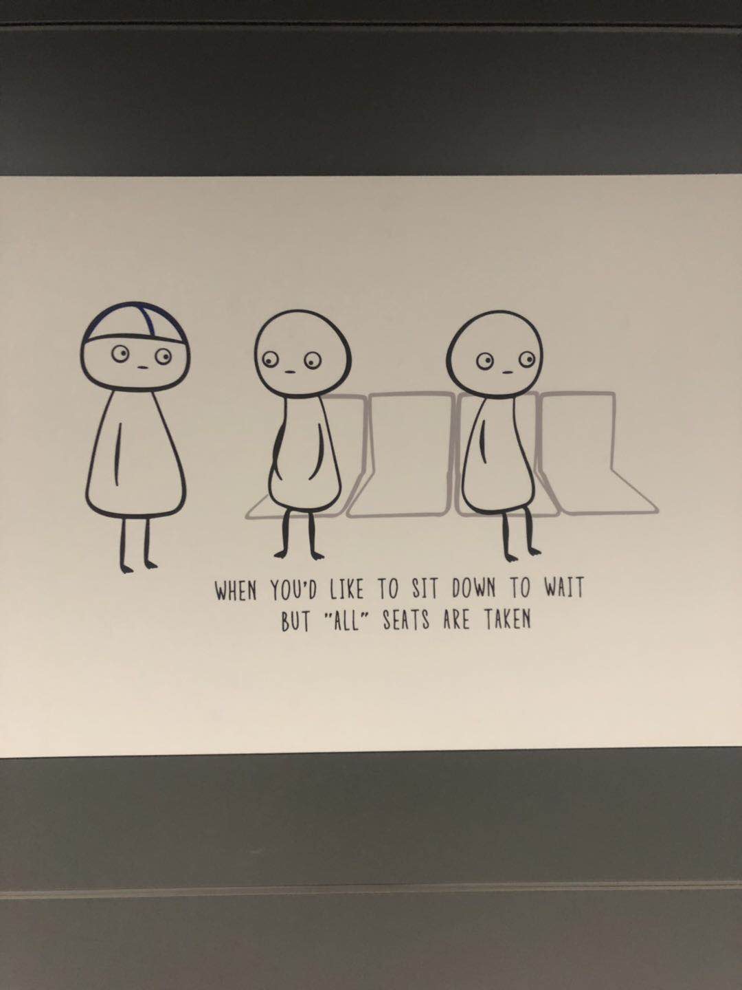 赫尔辛基的万塔机场航站楼的墙上是芬兰平面设计师卡罗利娜·科尔霍宁(Karoliina Korhonen)的系列漫画《芬兰人的噩梦:另类芬兰社交指南》,一共有很多幅,对社交恐惧症的人来说应该每一幅都很能引起共鸣了。