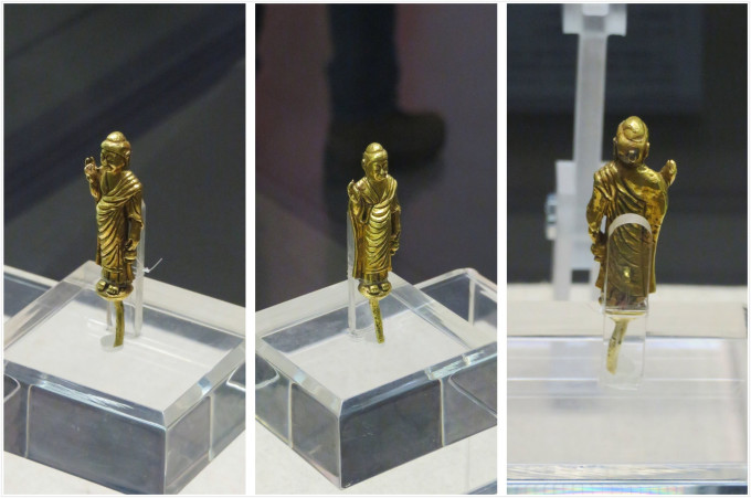 渤海上京城遗址出土小金佛,造像穿戴整齐,左手提净水瓶,与唐代造像袈裟敞开,袒露胸腹不同,也是上京城遗址中发现的唯一一尊纯金佛像。