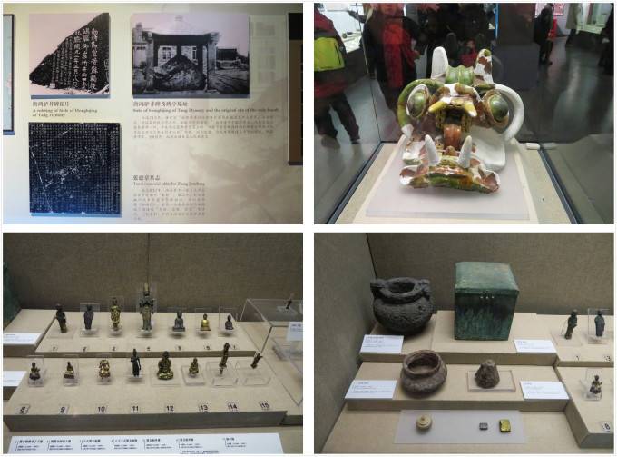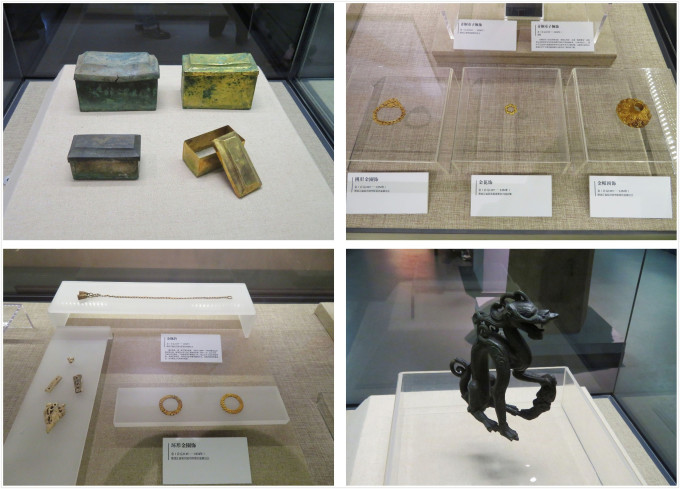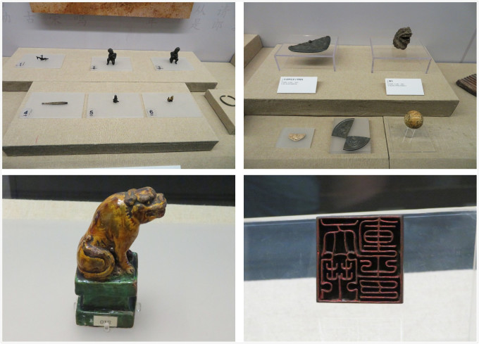 左上:渤海国文物,骑马铜人,胡人觐见跪像,鎏金铜鱼,鎏金骑鹅童子像,鎏金有插立狮像