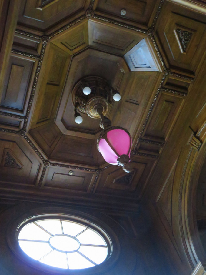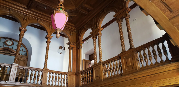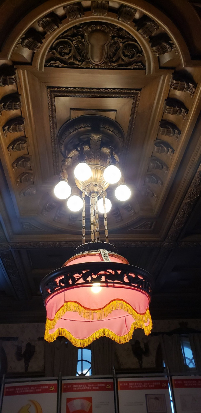 一楼大厅挂满灯笼,上面的数字不知道什么含义。扫黑除恶无处不在。