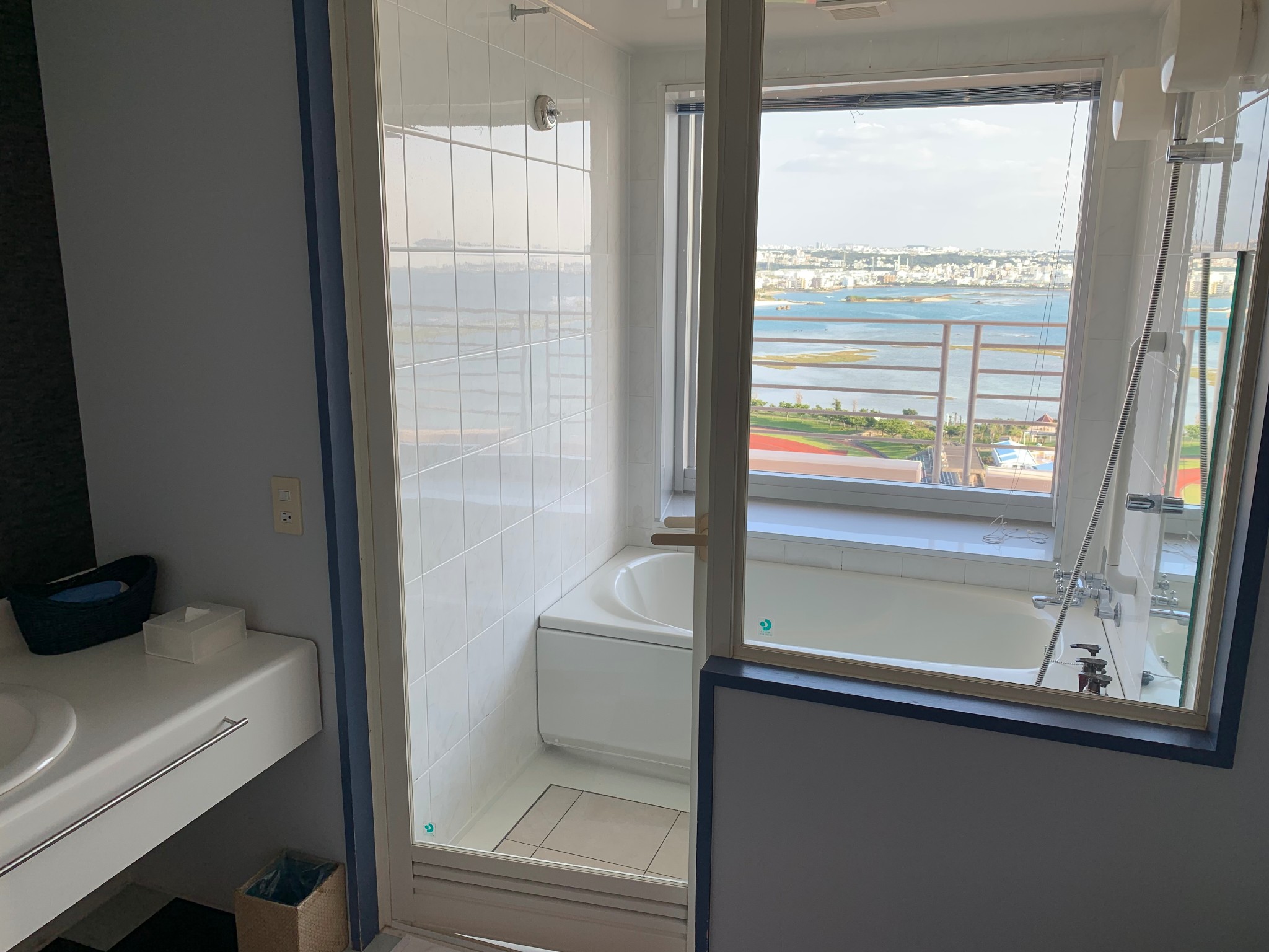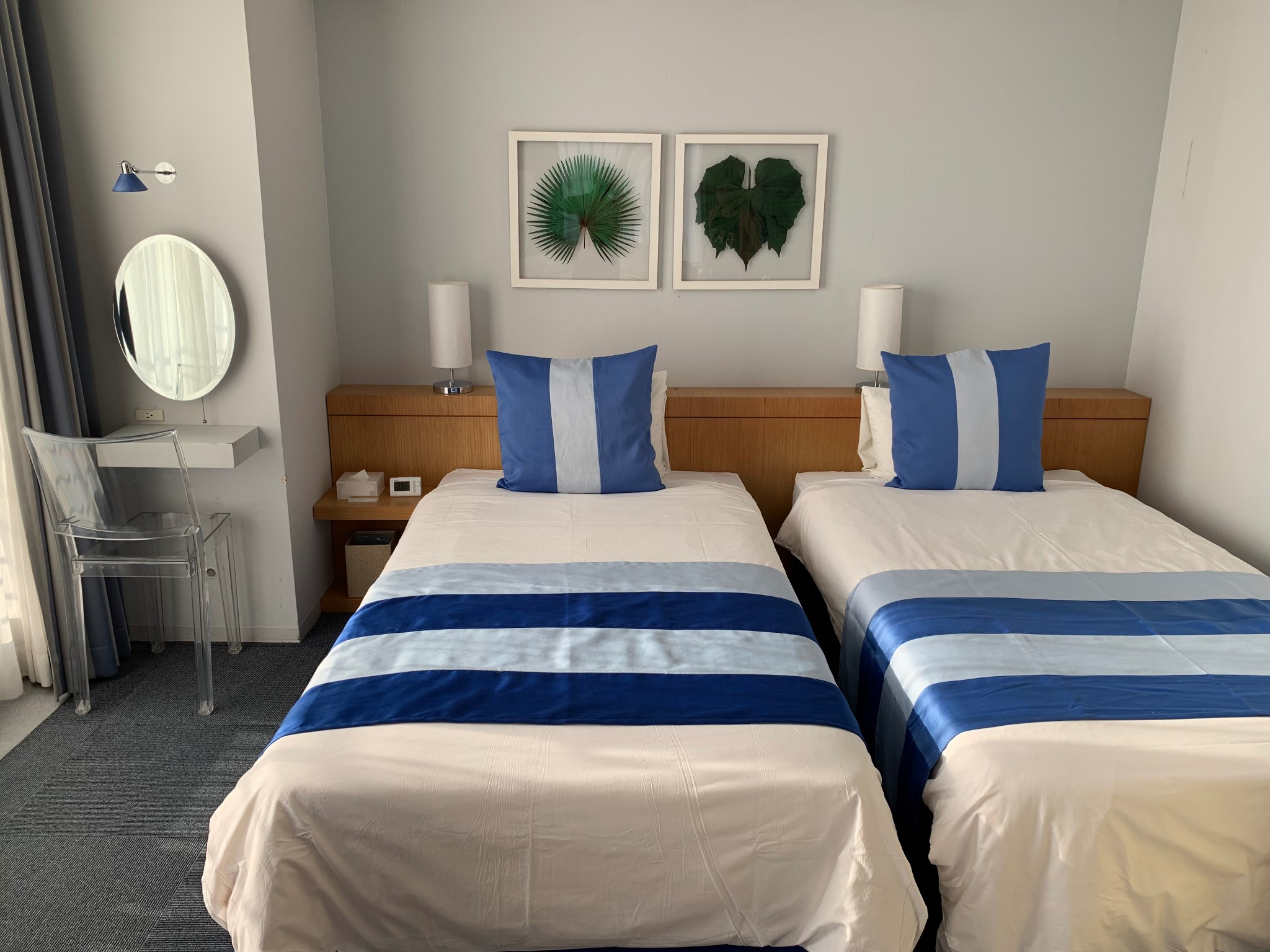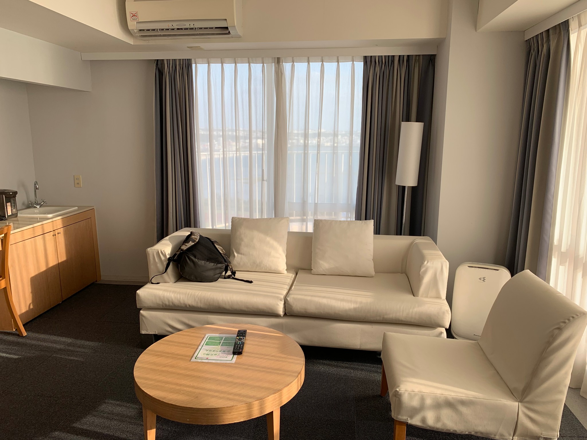 优点:房间有40多平方,我们幸运的升级到了转角房,视野开阔。有大大的电水壶、取水池、两个电视(只有5-6个日语频道)。3楼有洗衣间,酒店边上就是海滩,还有永旺。