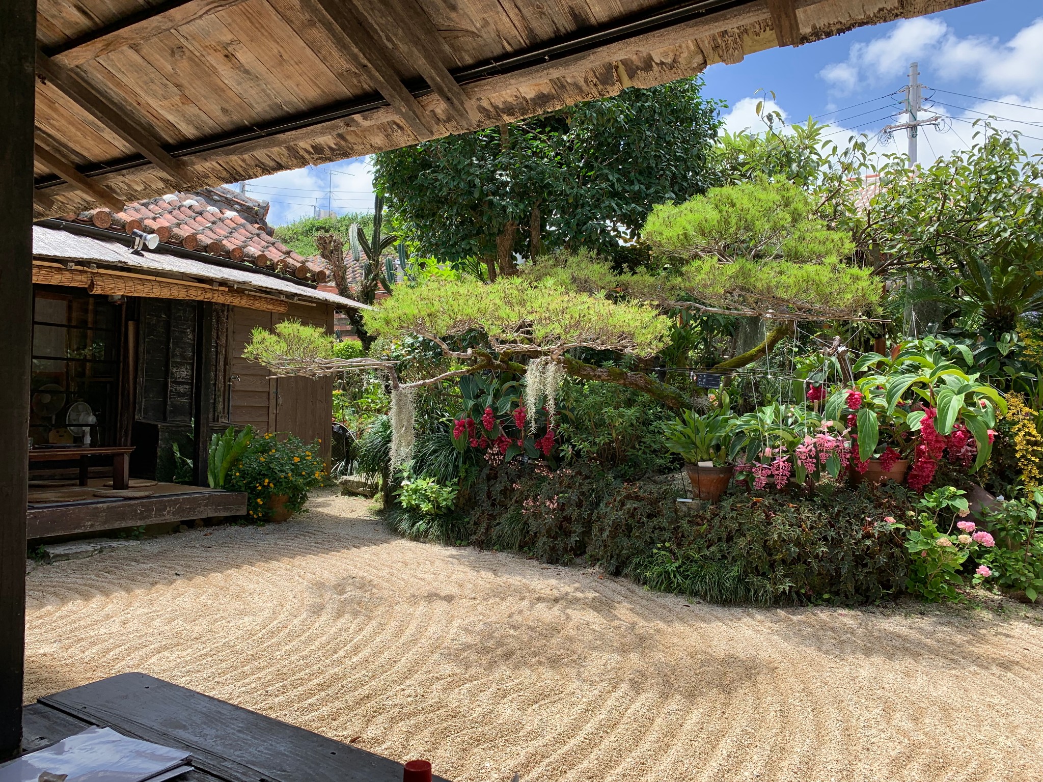 因为有个美丽的小院子而出名的店,离首里城步行约7-8分钟,11点开始营业,我们10点50到,排在了第二位。进去前要脱鞋放到木柜子里,服务员确认我们要坐在outside后,提醒我们注意野鸟,然后就入座了。外面临庭院的位子不多的,大概只有7,8桌吧,建议还是早点去,坐室内就没啥意思了。我们点了限量供应的炸猪扒套餐和猪蹄套餐,猪排饭的确赞,猪脚稍有骚味,胜在风景吧。一共2876日元,三个人分两份套餐足够了。