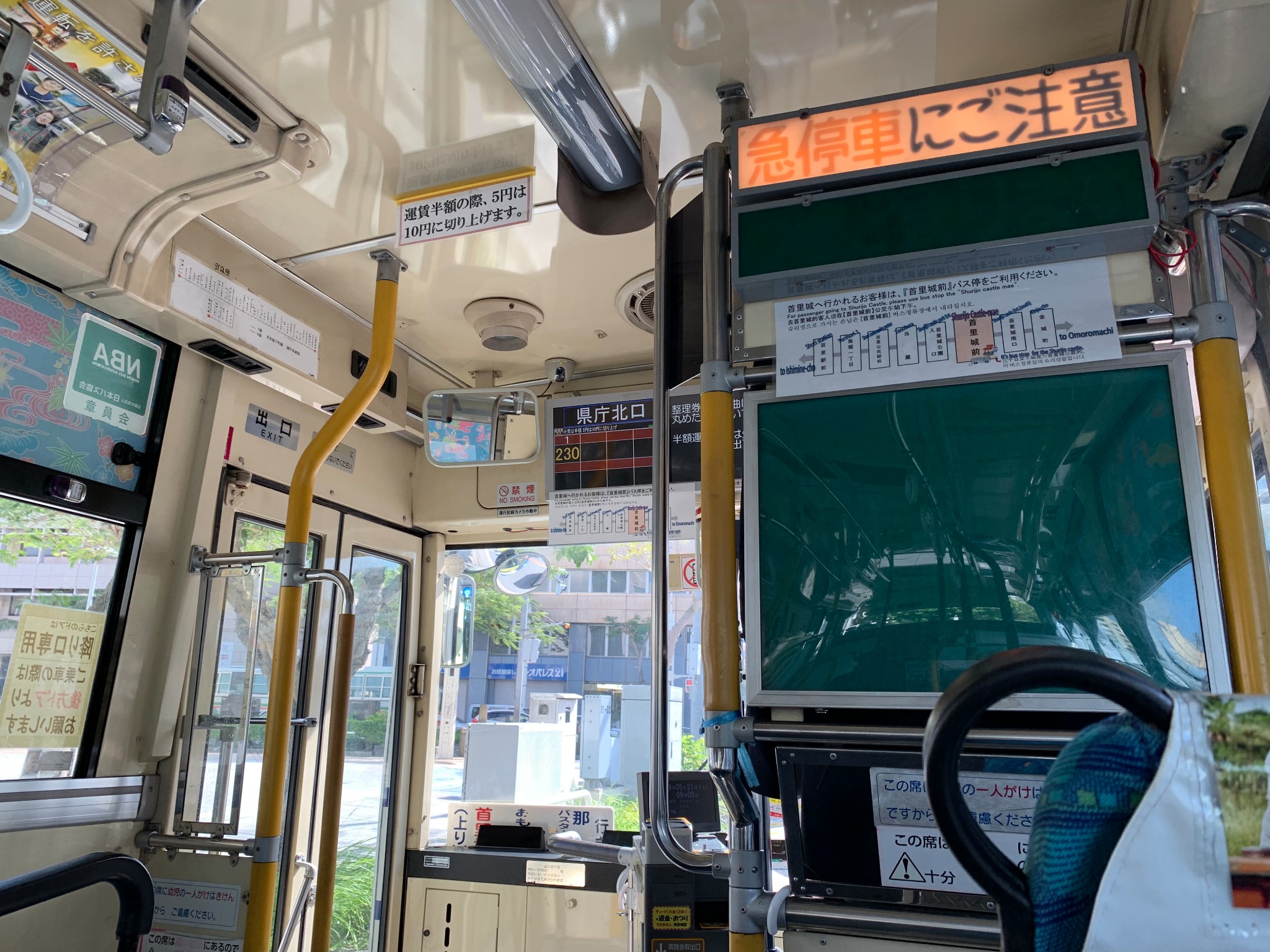 小贴士:需要上那霸公交网站 ( ****** )查下7路车始发的时间,比如我们选择的是8:55这班次。另外网上搜到的2016年写的攻略已经过期了,那时那霸公交总站还在建设中,现在7路车就是在总站的2号站台坐了,每个站台间隔15米左右,非常好认。上车后拿整理券,下车前记得按按钮告知司机要下车,下车前投币即可(230日元一个人,6岁以下免费)。