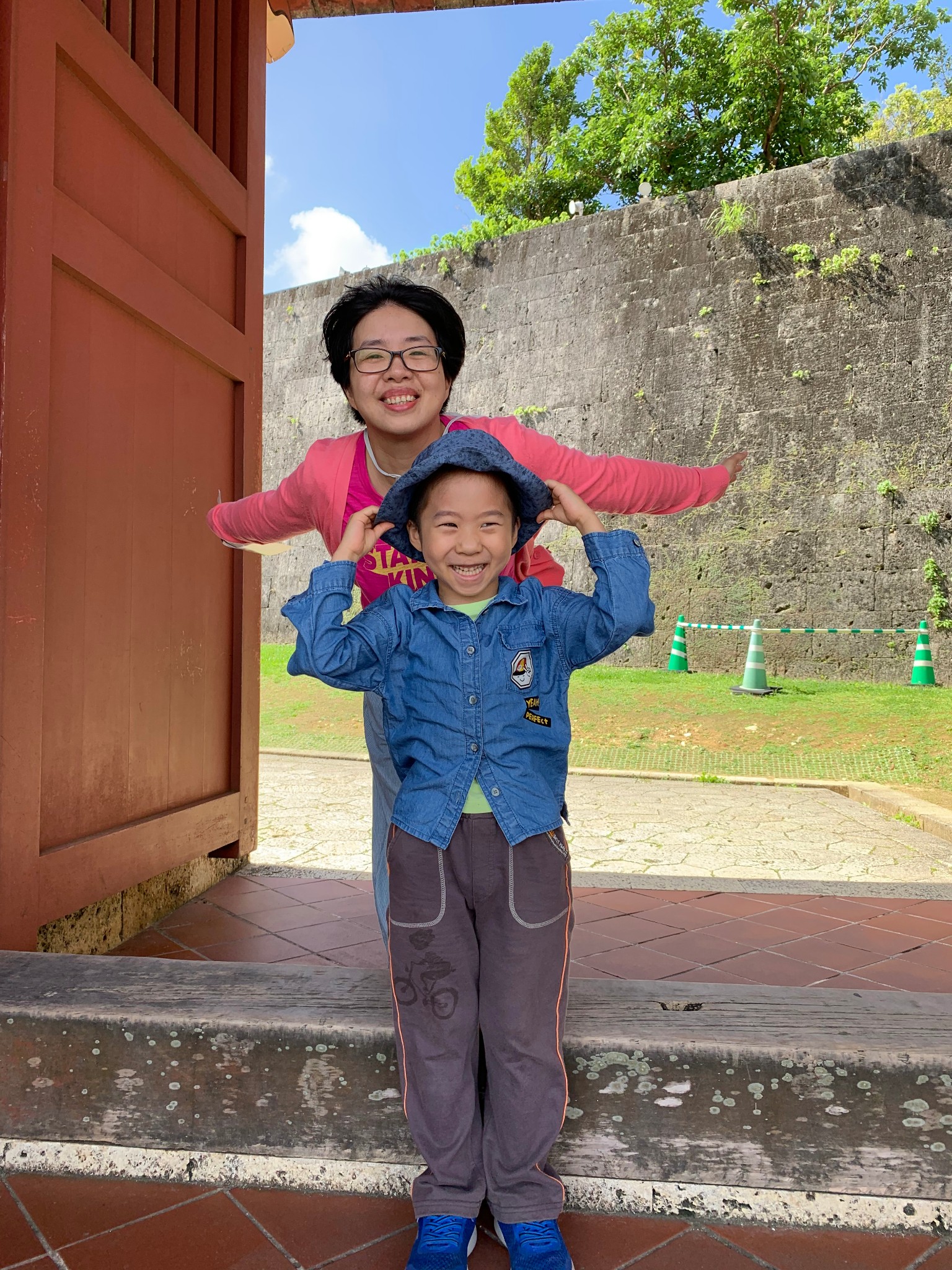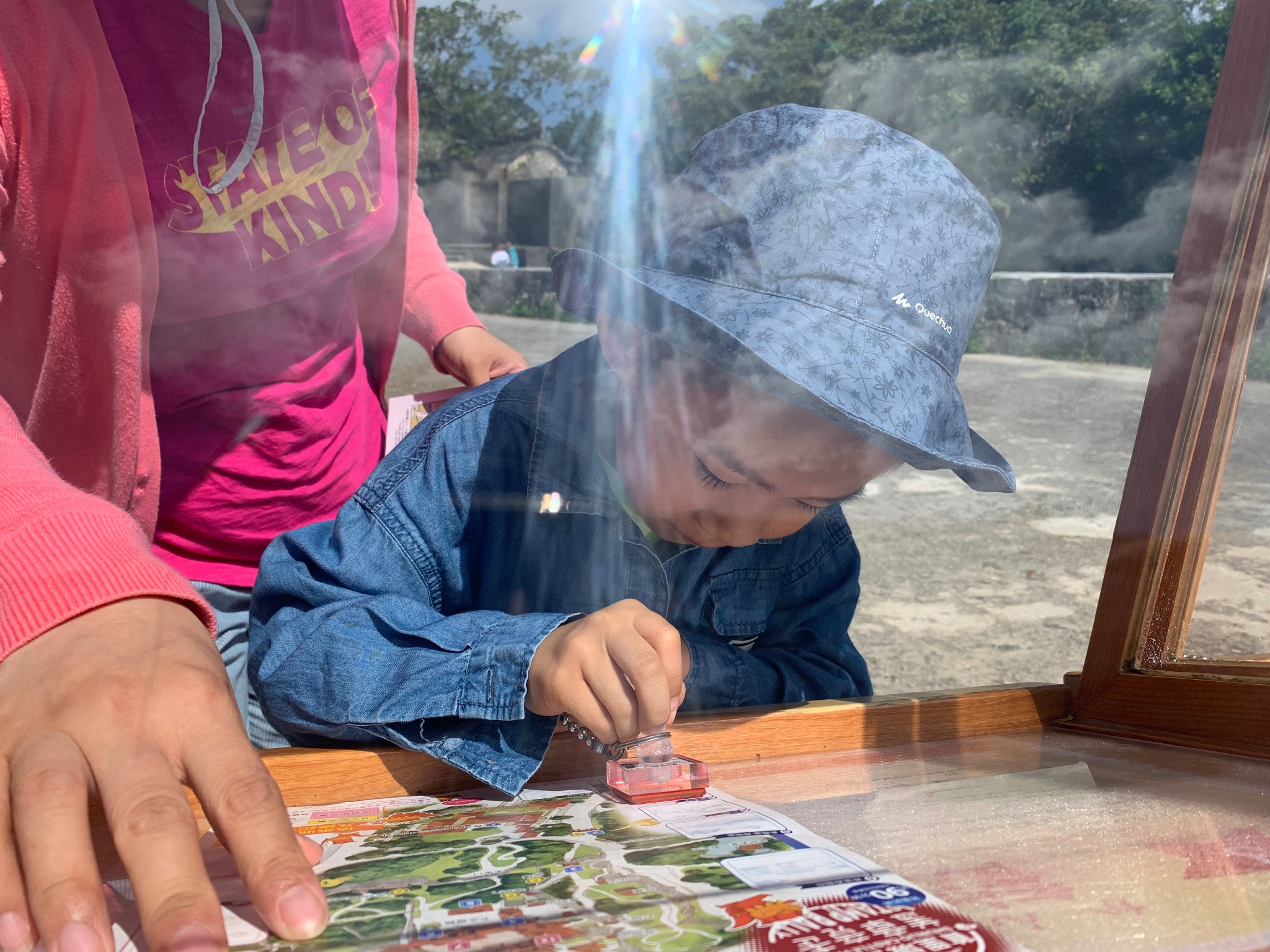 首里城风很大,最好玩的是进入内殿前,小朋友的帽子被风吹走了,好不容易捡回来后,他手上用来收集盖章的地图又被风吹跑了,大家就看到三个人满场追地图,好几次差点得手又被吹跑了,最后他使出无影脚,一把踩住地图才算到手了