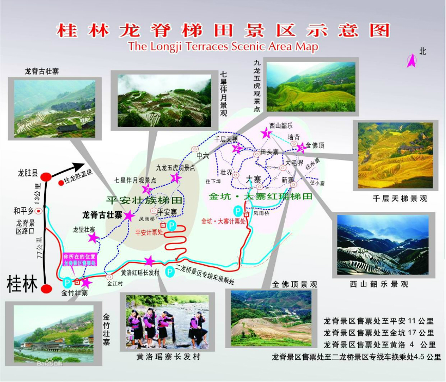 龙脊梯田是一个景区的统称,其实际囊括龙脊寨(壮族)、平安寨(壮族)、中六寨(瑶族)、大寨(瑶族)、田头寨(瑶族)、小寨(瑶族)等若干村寨。就梯田本身而言,最壮观的是大寨的金坑梯田和附近的小寨梯田。中国中央电视台第12套的片头以及大家经常看见的龙脊梯田宣传图片和影视作品,绝大部分都是出自金坑梯田。平安寨的“七星伴月”景观也非常不错,它就是狭义上大家所指的龙脊梯田
