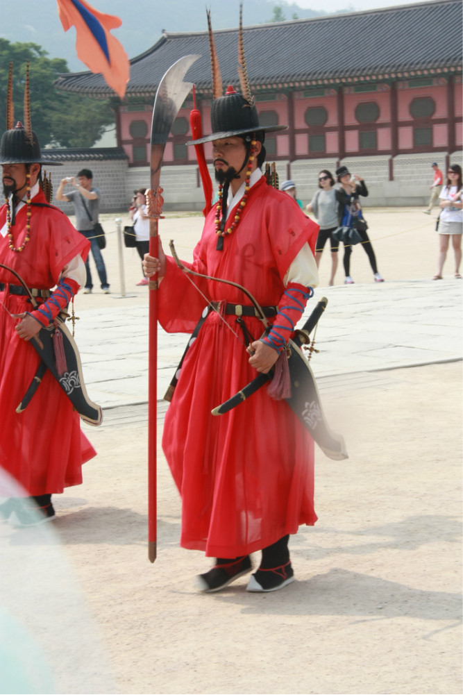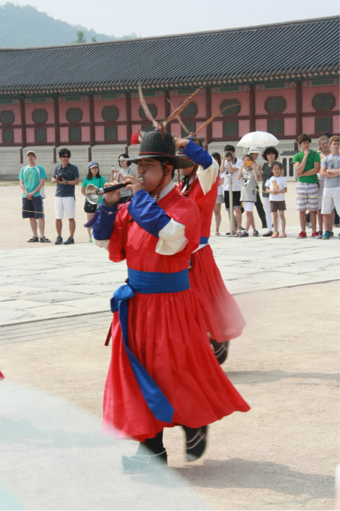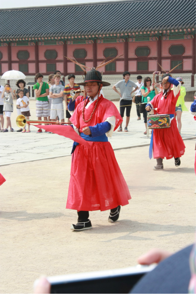 我们是在下午大约2点左右到的景福宫(北京时间)。正好赶上一个表演。阅兵?不像。似乎是一个接待或者觐见仪式。表演的人数也不算很多,气势也算不上很宏大。
