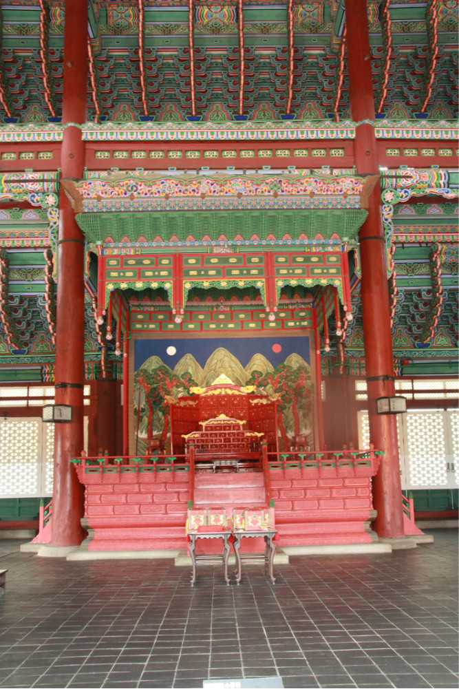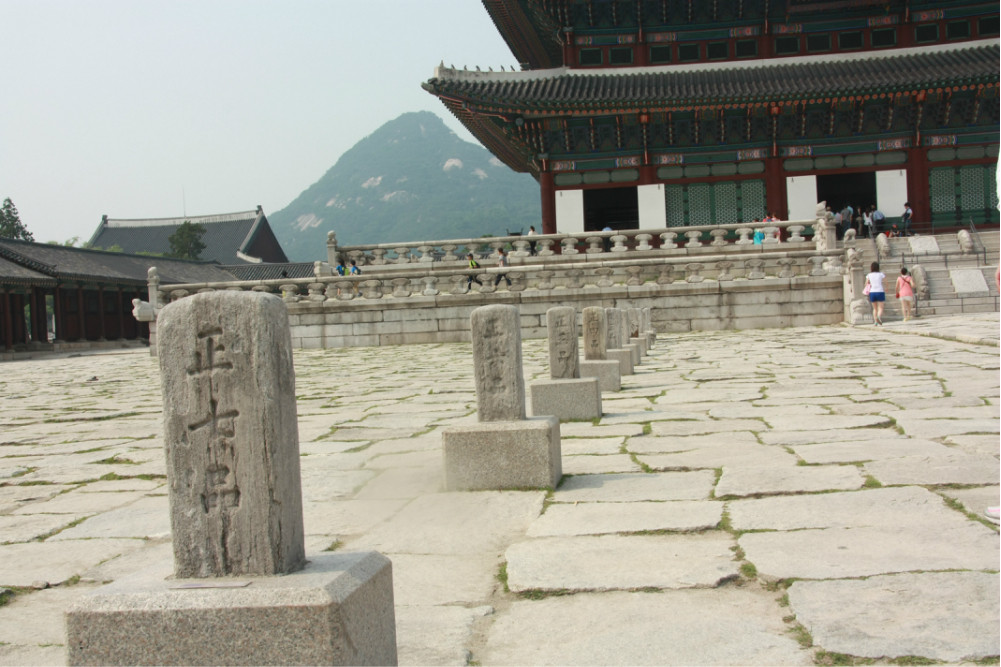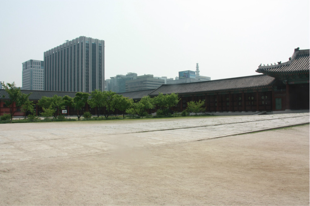 勤政殿。是举行正式仪式以及接受百官朝贺的大殿。场的地面铺以花岗岩,分三条道路。中间的道路稍高、稍宽,是国王走的路,两侧的稍低一些,是文武百官走的路。