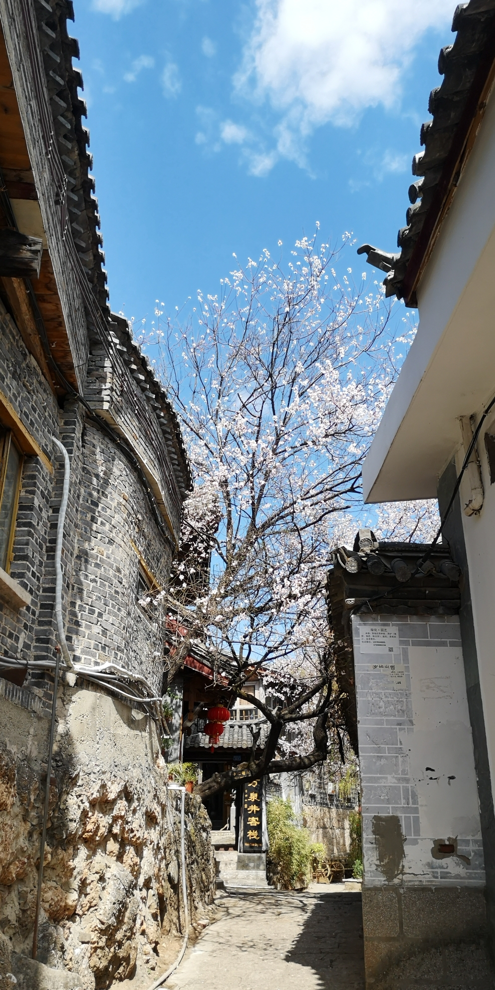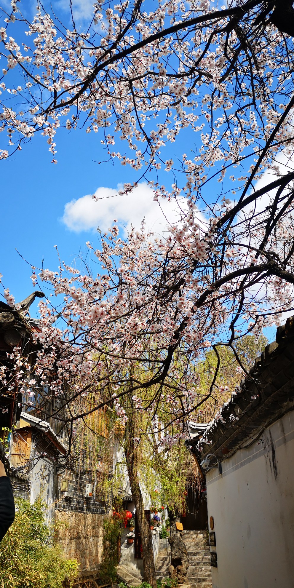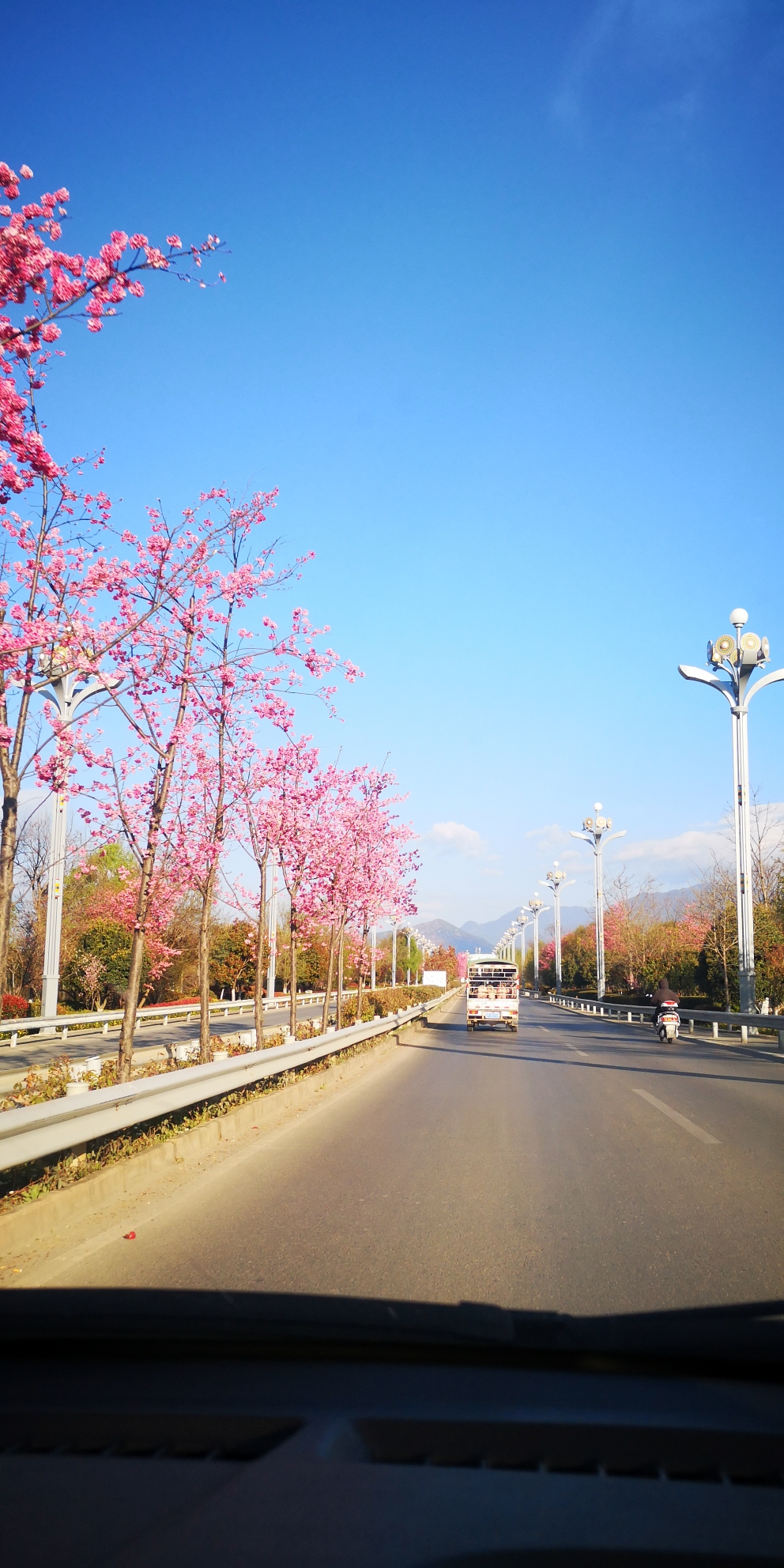 提前一晚从 广州 飞到 昆明 ,第二天一早从 昆明 飞到 丽江 ,预先让客栈帮我们预约好接机的车直接载我们到大研古镇的客栈,机场到古镇一般80元一车,在路上看到 丽江 随处可见一排排的樱花。