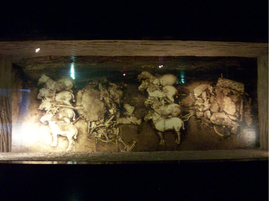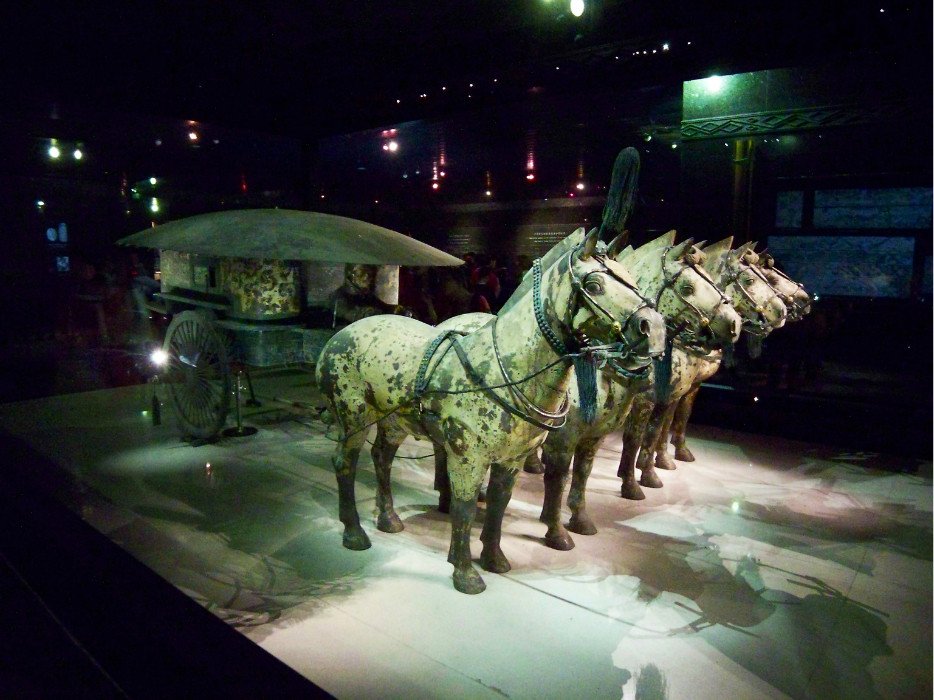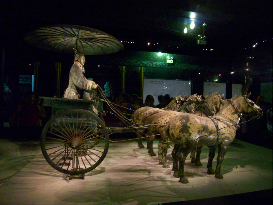 精美绝伦的铜车马,车上有武器架-弩架,有遮阳伞,伞箍十二根表示一年有12个月,车轮轮毂有30条表示每月有30天,马身上是金银焊接的带子,遮阳伞可调节多个角度。