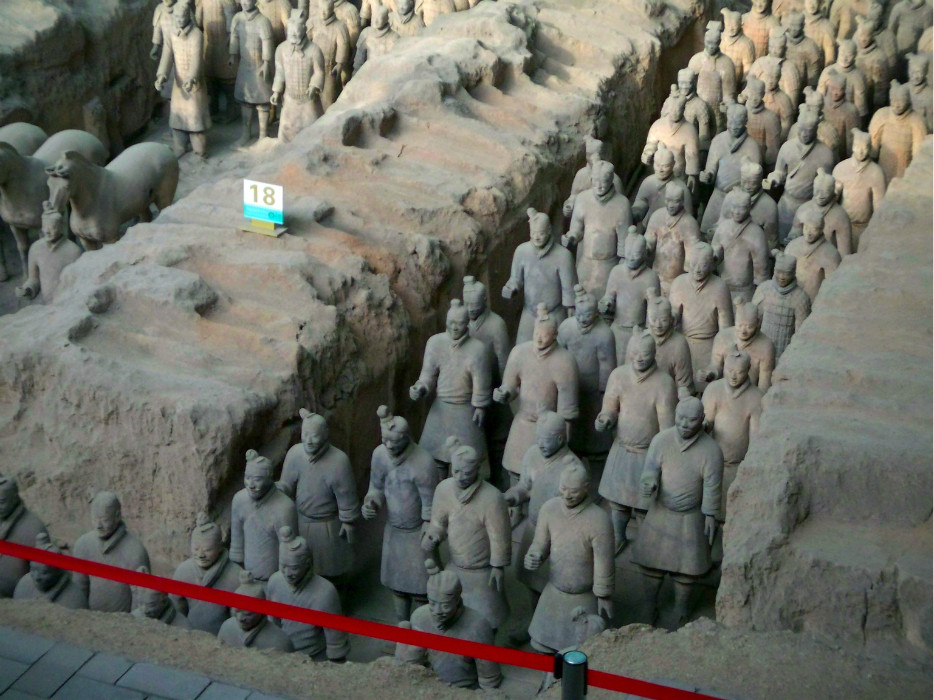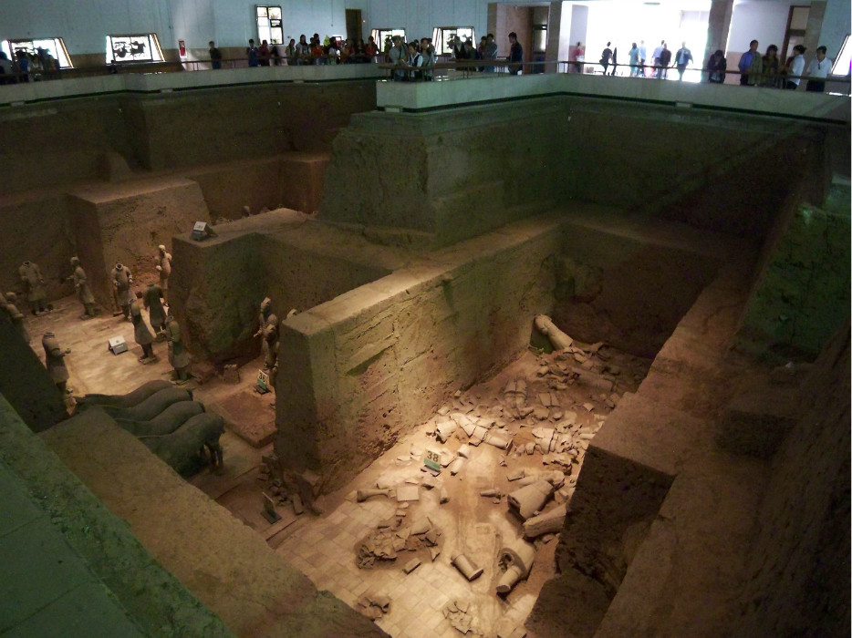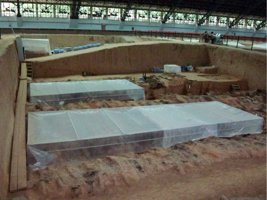 图中道路上白线之下是挖开又回填的四号坑,坑里啥都没有,有人说是来不及放陶俑,有人说是粮草后勤部队