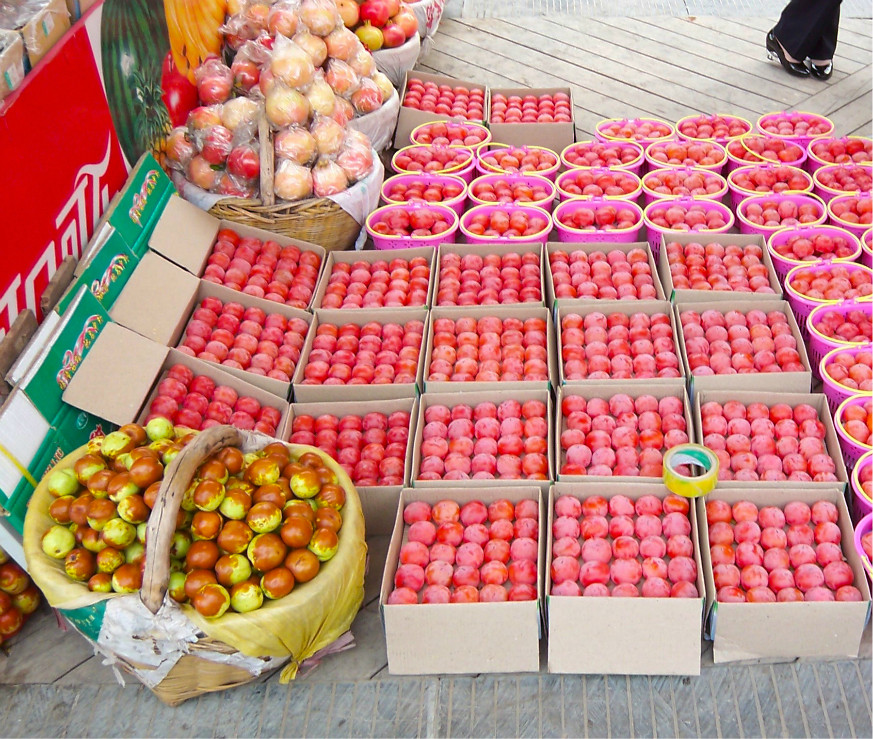 馆外有销售陕西 特产——柿子、苹果、大枣,柿子是越小越好吃