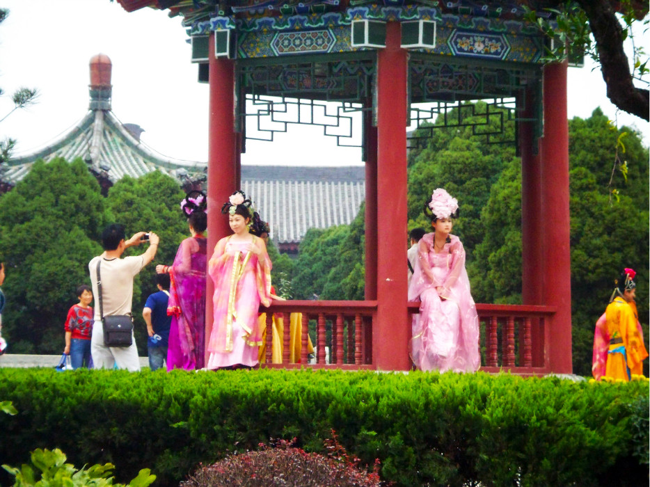 第二道门前,古装美女边舞边向游人抛洒花瓣,她们的舞姿及其优雅