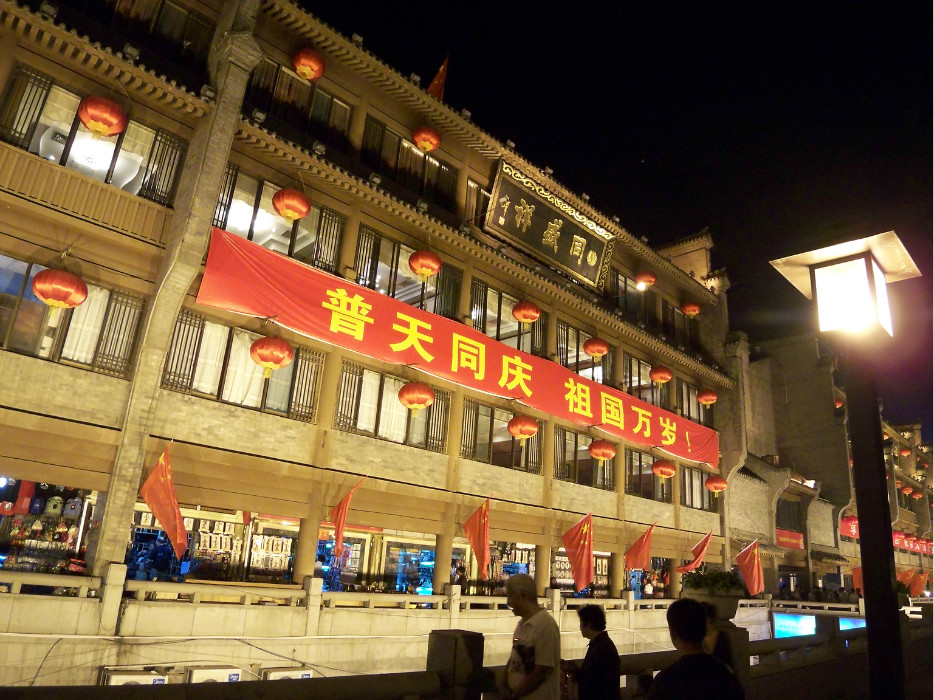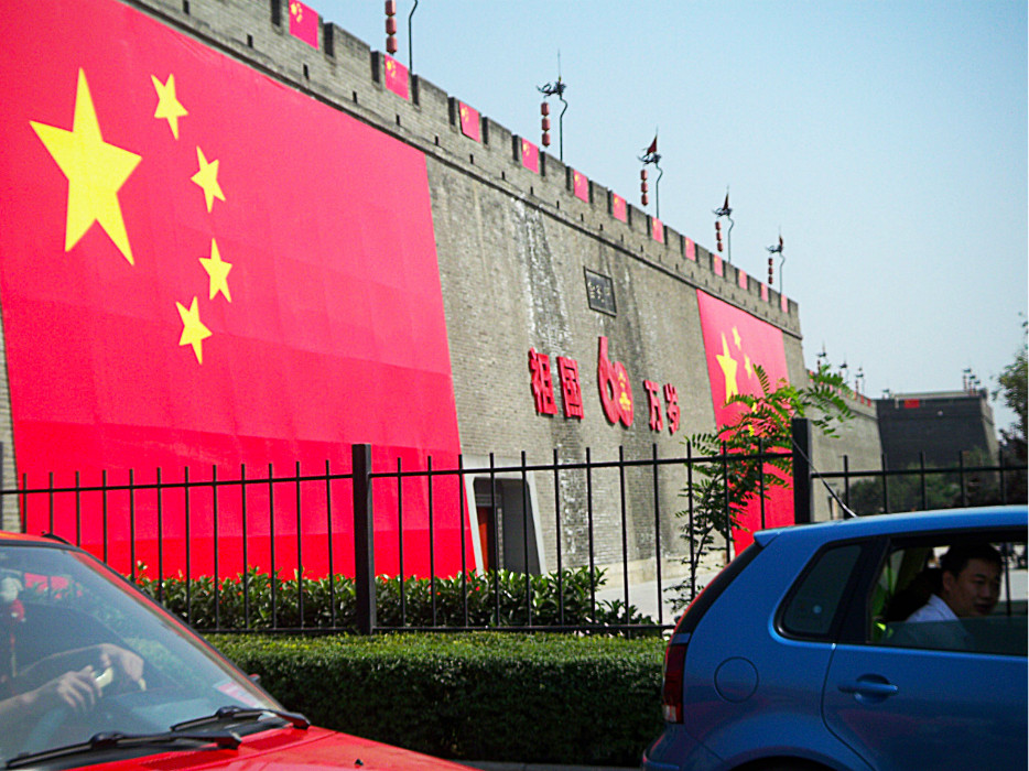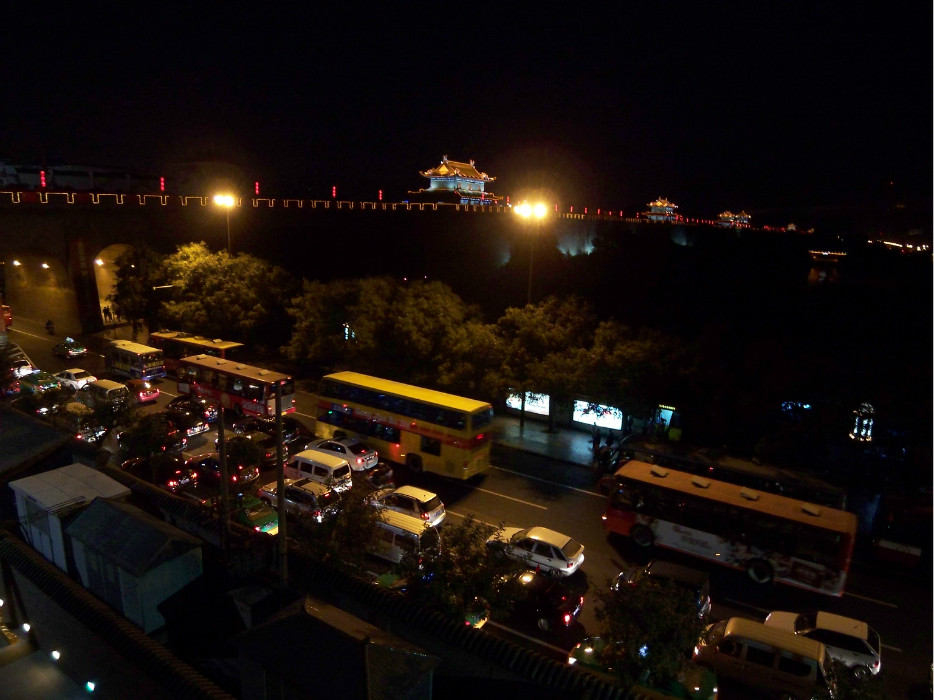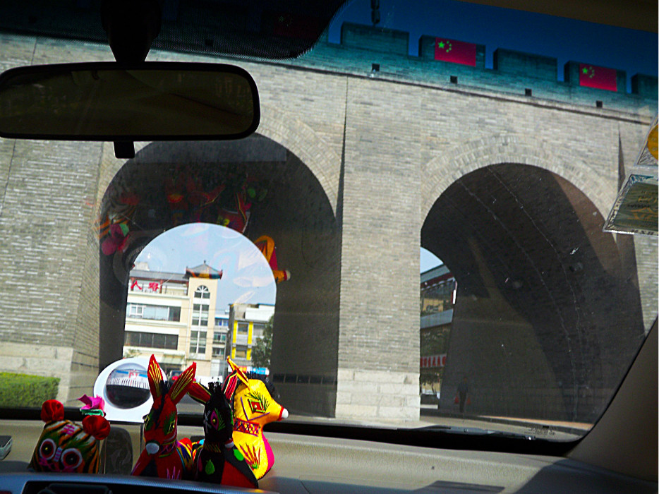 开车进城回住处,城墙上到处是国庆气氛,从这张开始许多张都是我儿子拍的,我开车。小家伙的摄影兴致很高的,看来这也遗传啊