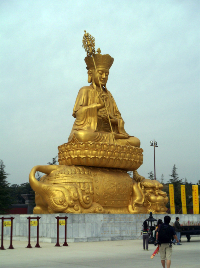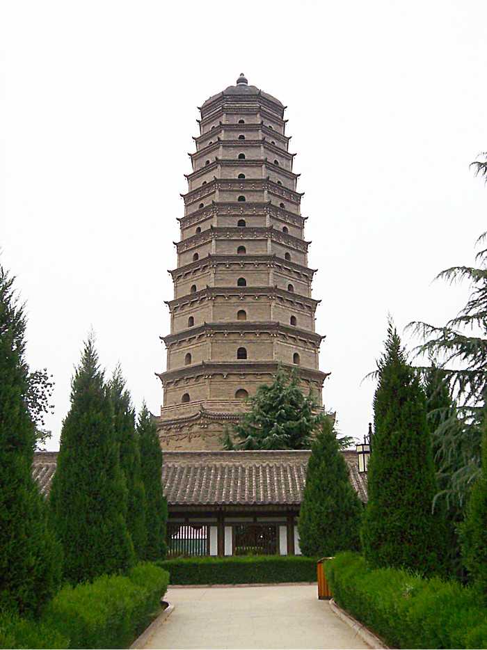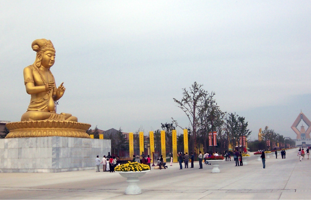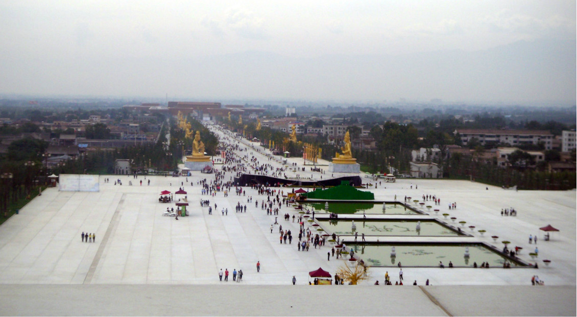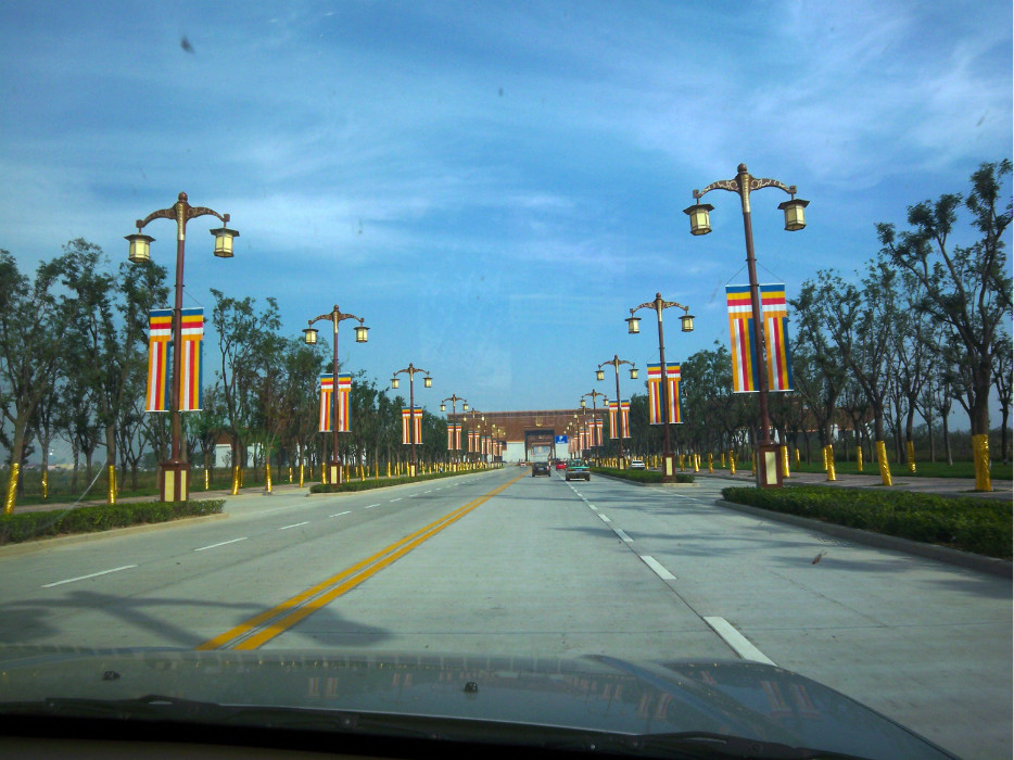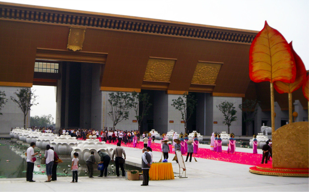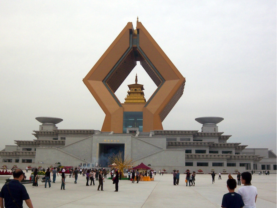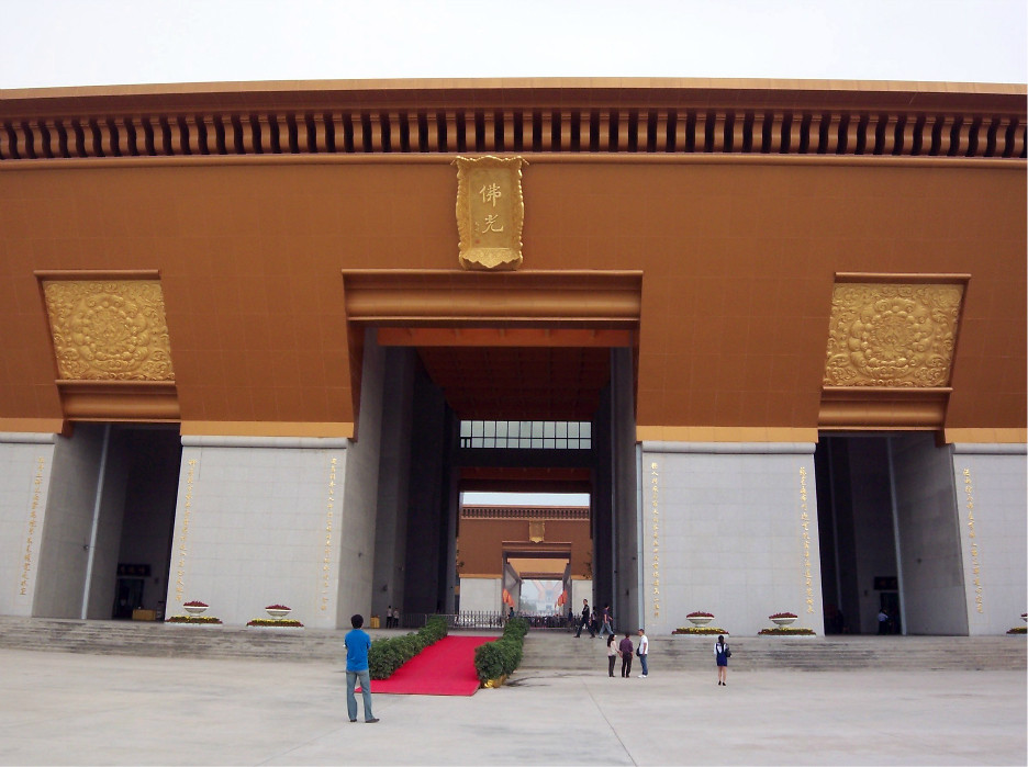 过了二道门,需要穿过一段长路前往合十舍利塔,148米的法门寺 合十舍利塔于2009年5月9日落成。造型如同合十的双手,中间镂空部分是一座传统形式的唐塔。塔前铺设了一条长达1230米、宽108米的佛光大道,一些源于佛教经典题材的景观小品及金色菩萨 像点缀在大道两侧。大道两头分别是可容十万人的朝圣广场与山门广场。