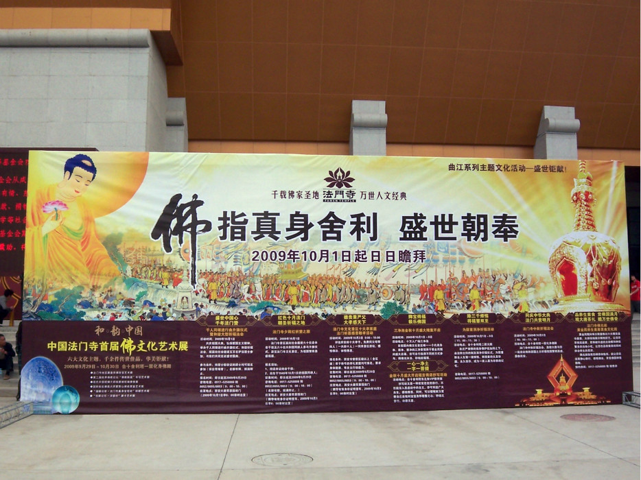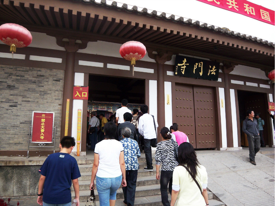 从禅拜入口进去参观佛指舍利,可惜不让拍照,我们进了两遍!好好看了看,在1987年5月5日至12日,舍利地宫打开期间共发现有4枚舍利。其中两枚为白玉 所制,另一枚为一高僧的舍利。这三枚都属于“影骨”,和“灵骨”放置在一起是为了保护后者。“灵骨”色黄而有似骨质的颗粒分泌物,经专家鉴定,这一枚就是真身佛骨。法门寺 也随着真身舍利的出土而成为佛教的胜地。