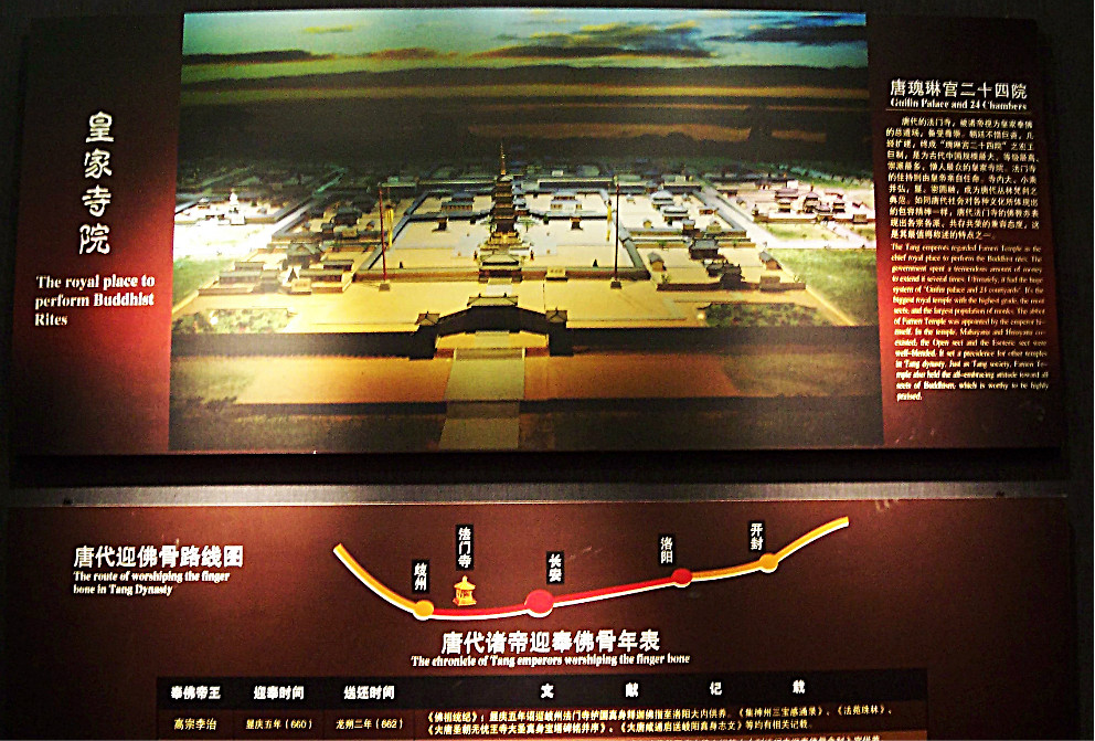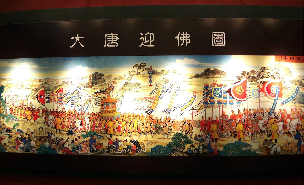 1987年4月3日发现法门寺 唐代地宫,在地下沉睡1113年的辉煌灿烂的唐代文化宝藏――佛教世界千百年来梦寐以求的佛祖释迦牟尼真身指骨舍利、李唐王朝最后完成的大唐佛教密宗佛舍利供养曼茶罗世界以及数千件李唐皇室供佛绝代珍宝得以面世,这批文物包括:四枚佛祖释迦牟尼真身指骨舍利,这是目前世界仅存的佛指舍利;唐皇室供奉的一百二十一件(组)金银器;首次发现的唐皇室秘色瓷系列;米至古罗马 等地的琉璃器群;上千件荟萃唐代丝织工艺的丝(金)织物,其中包括武则天等唐皇帝后绣裙、服饰等均是稀世珍宝;这些奇珍异宝数量之多、品类之繁、等级之高、保存之完好是极为罕见的。
