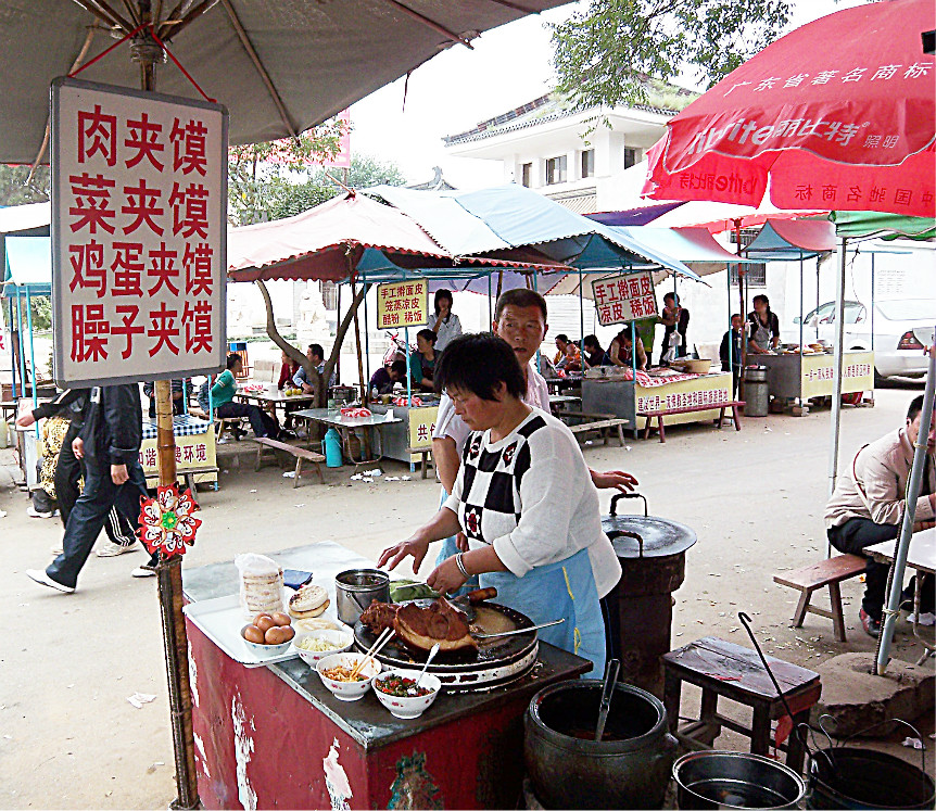 出了古寺大门,门前道路上净是特色食品,看看那大饼多么厚!怎么吃呀