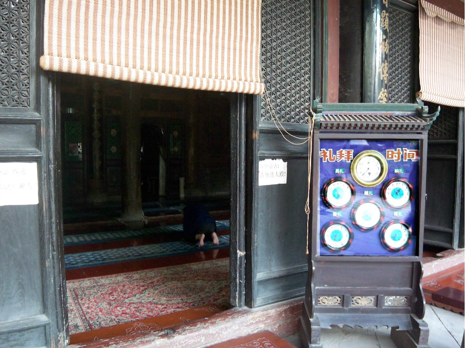 门口的6个圆盘是做礼拜时间的钟盘,寺里有位老人在虔诚的做礼拜