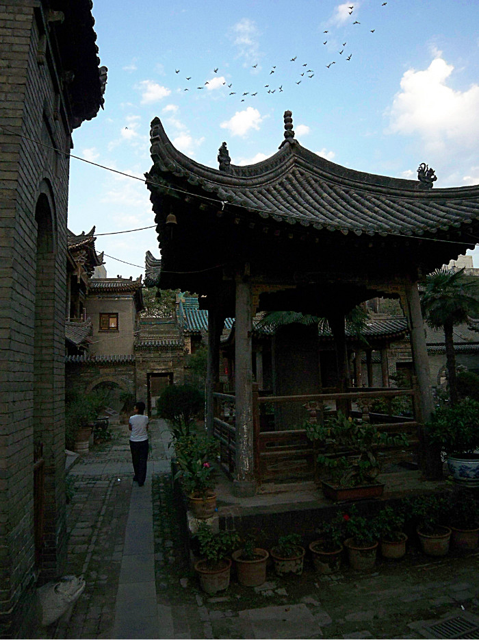 清真寺一隅,降低白平衡找角度拍照,无意中竟拍到了蓝天白云中的群鸟