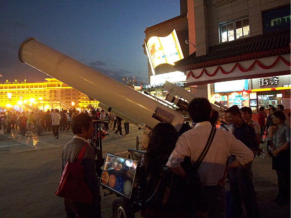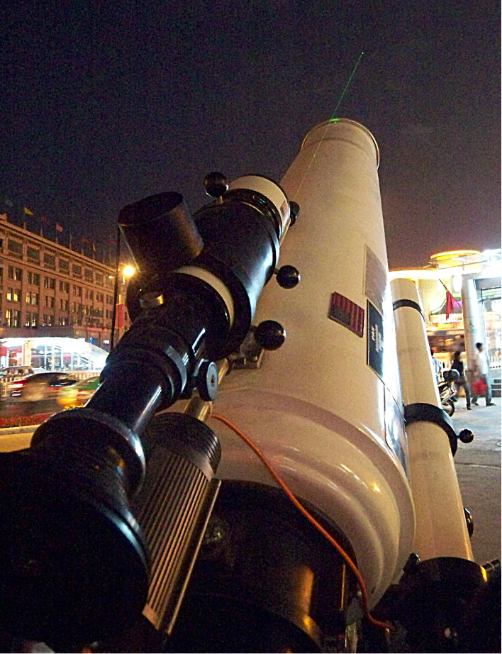 有天文爱好者在介绍天文、观星知识,10元看一次,我居然看到了木星的4颗卫星和木星的花纹,不虚此行!这个大炮还用绿色激光来指向目标