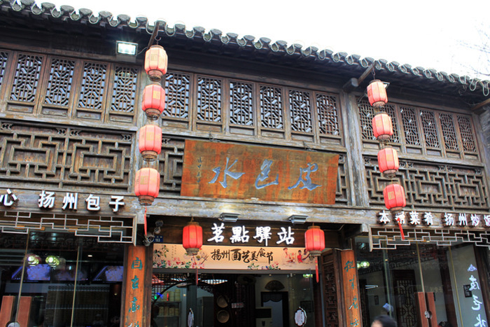 街两旁林立着各色扬州老字号商铺,老四美东关酱园、谢馥春香粉店、戴春林、冶春茶社、皮包水、扬州三把刀等等。