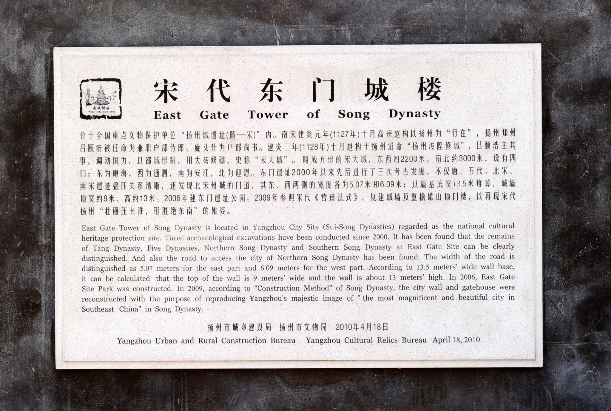 宋代东门城楼 ,位于“扬州城遗址(隋—宋)”内。建于南宋建炎二年(1128年),史称“宋大城”。略成方形的宋大城,设有四门:东为康海,西为通泗,南为安江,北为迎恩。东门遗址2OOO年以来,先后进行了三次考古发掘,不仅唐、五代、北宋、南宋遗迹叠压关系清晰,还发现北宋州城的门道。