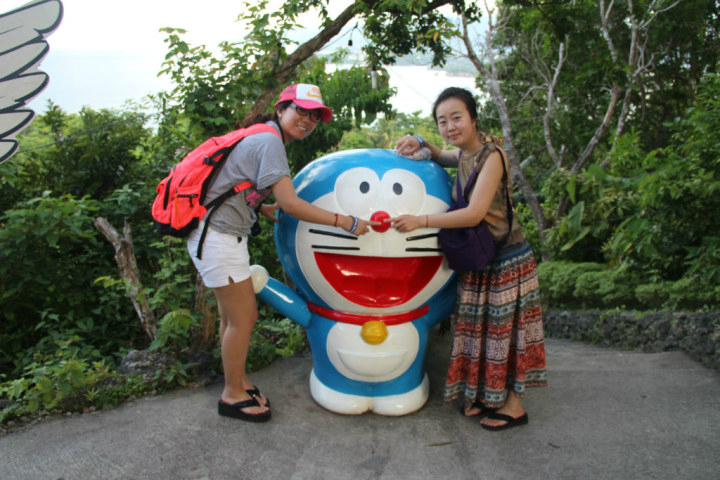 坐卡丁车上了山顶这边有喜欢的多啦A梦,就是冲着他才来的。