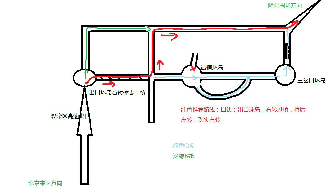 1、京承高速双滦区出口下高速以后,右手边能够看到一座桥。在环岛右转上桥,过桥以后紧接着左转一直开到尽头的斜丁字路右转。然后就可以一直直行往隆化,围场方向 。(即:图2红色路线)