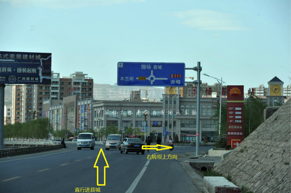 3、进入围场县城,能够看到客运站左右各有一条路,走右边的,继续直行。指往塞罕坝国家森林公园、御道口草原方向。
