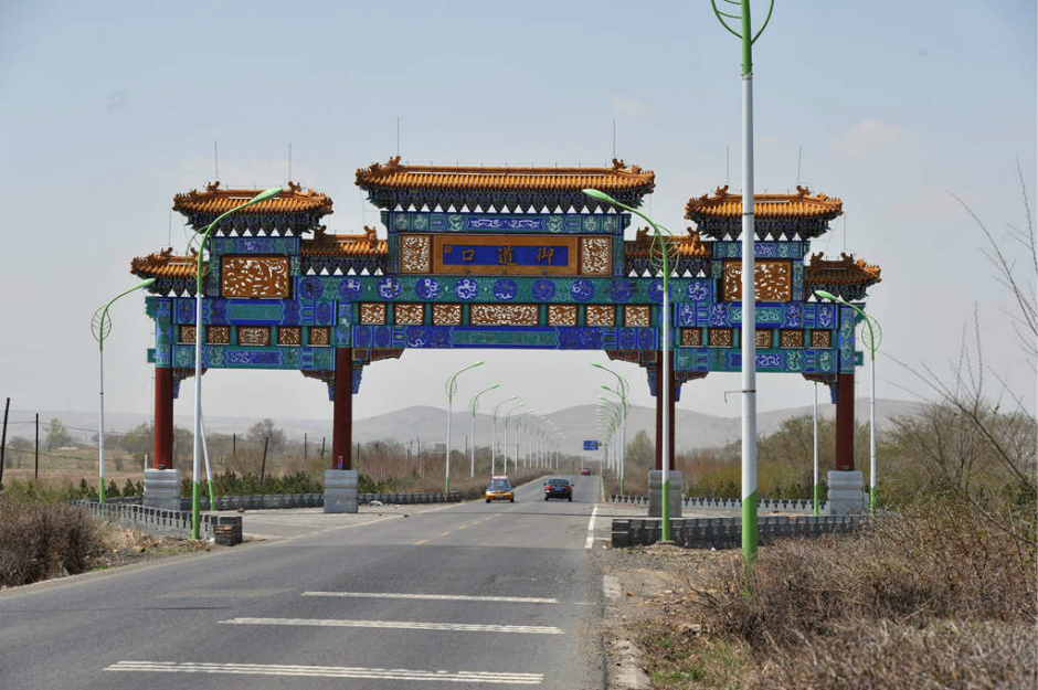 4、行驶大概10公里,能看到一块塞罕坝国家森林公园的大广告牌,让你往右转。不要管它,左转驶上前往多伦的道路,前行70公里左右能到达御道口的大牌坊。