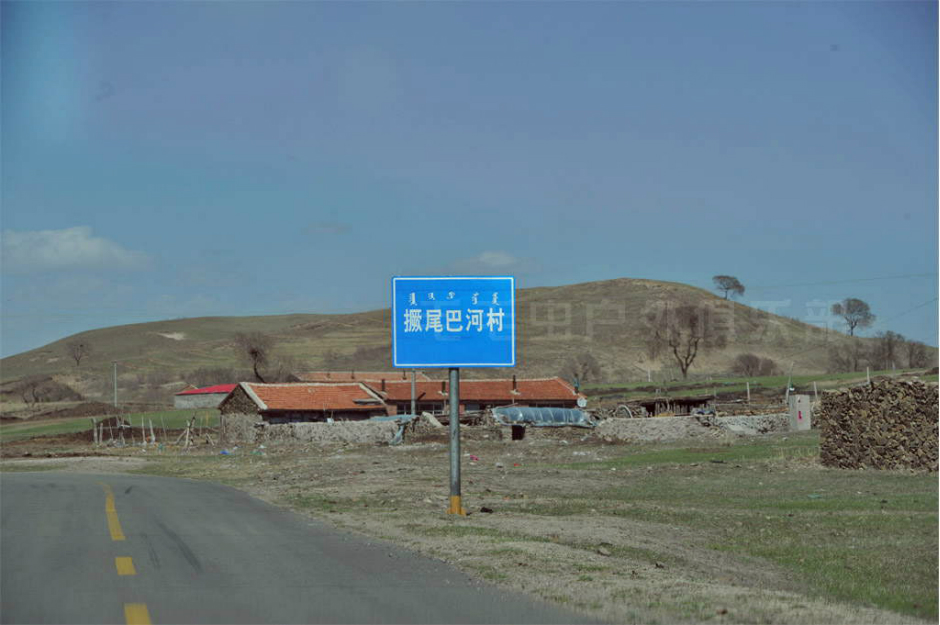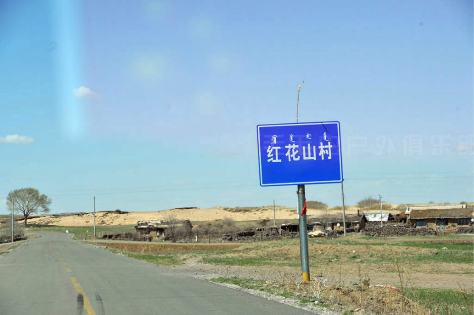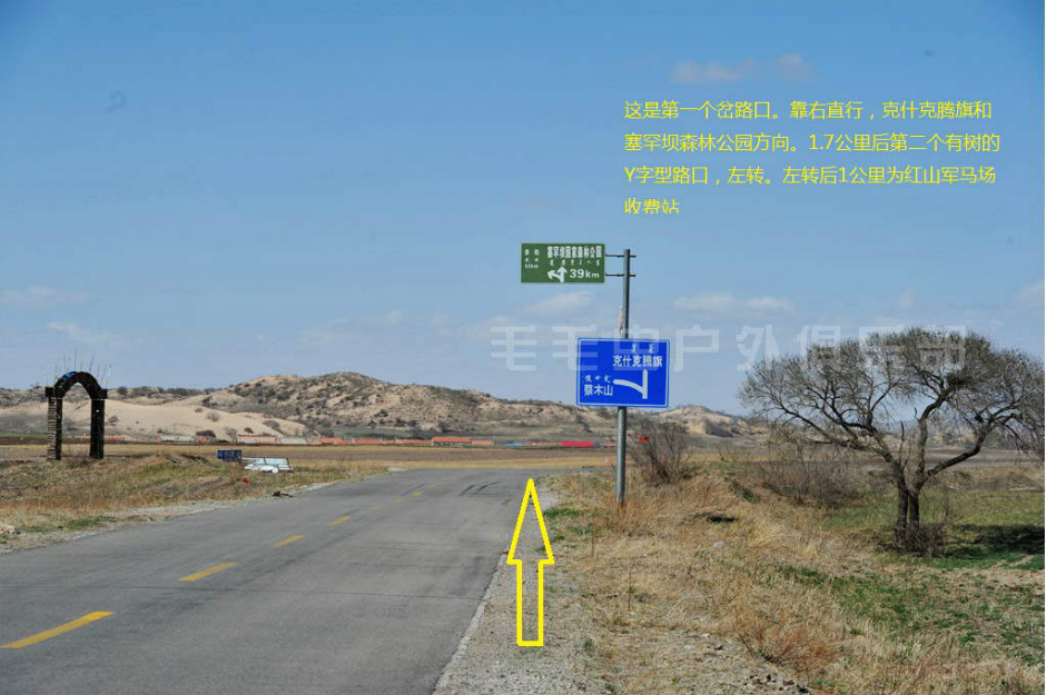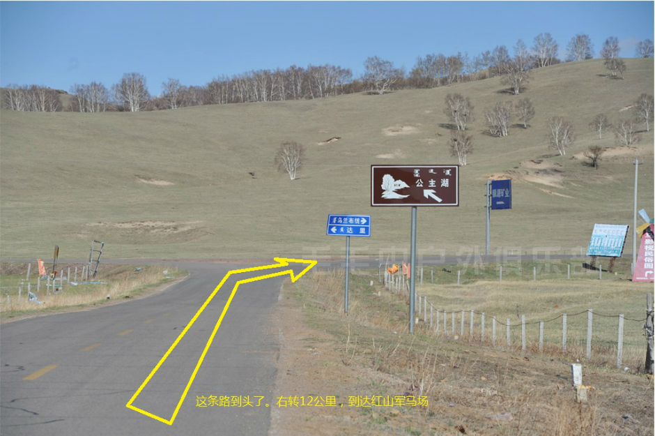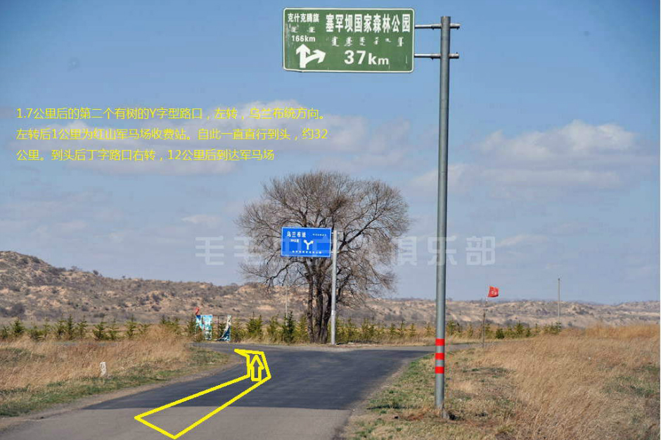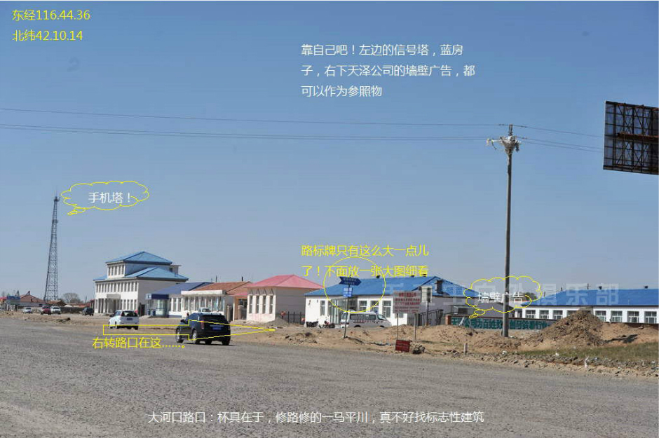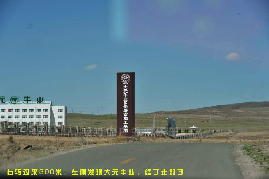 注意:从土路上到公路上以后,正对着一条小路和左转的大路,右手边是正在修的公路。往正前方远处看,能看到“大元牛业”的牌子,这条小路就是通往乌兰布统的路了。