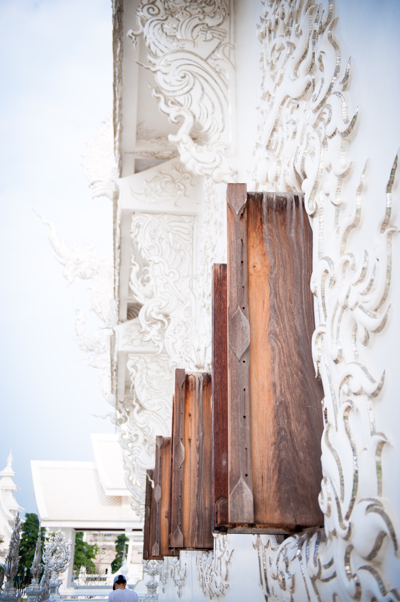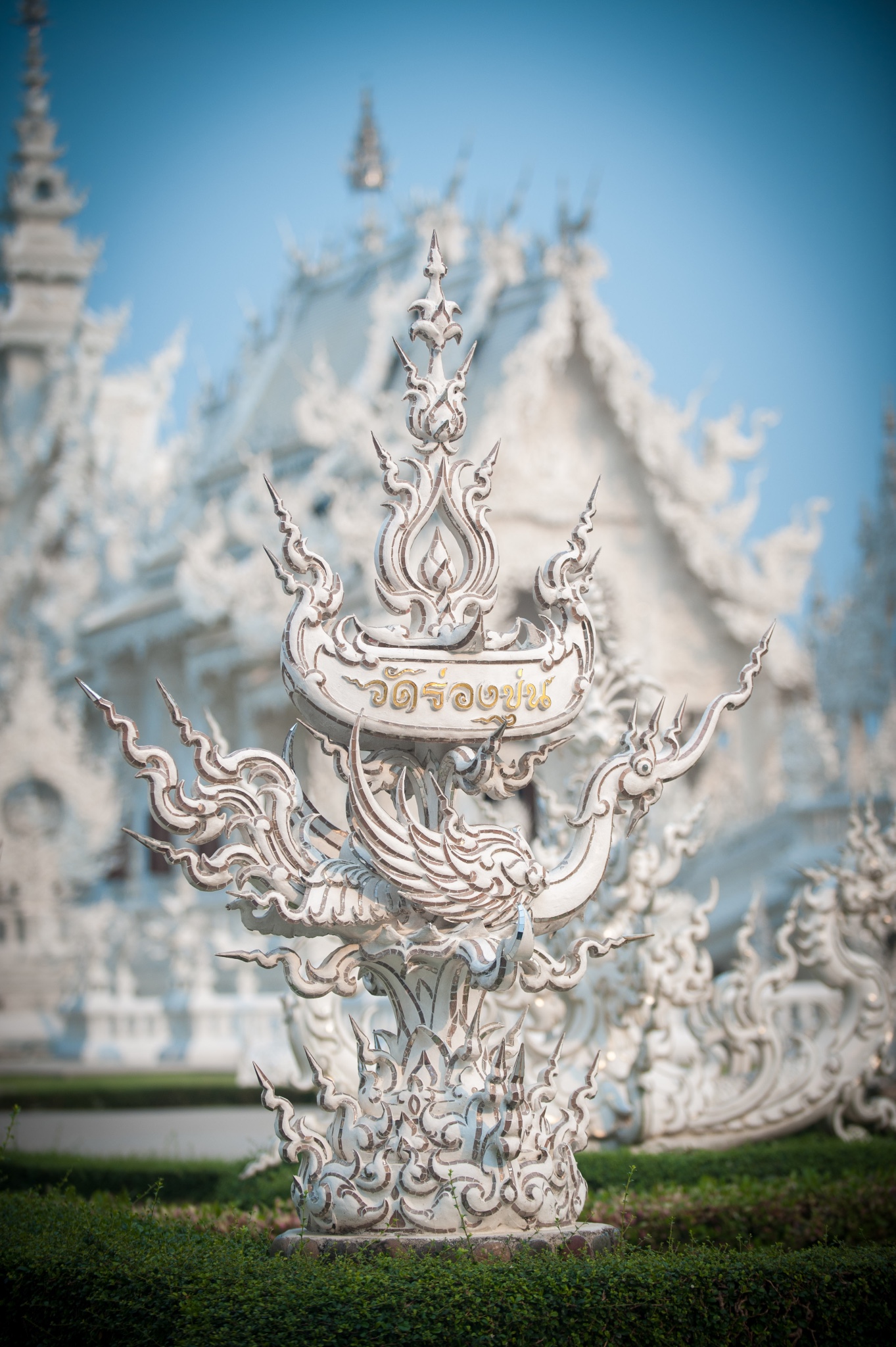 白庙是由泰国著名建筑师Chalermchai Kositpipat设计建造,建庙资金来自他二十年来的积蓄,以及有心人的捐献,他在建造中间曾经几次修改图纸,工程做的特别慢。但也正因为他对佛祖的 忠诚 ,还有对建筑设计的执着,造就了这么一个精细,完美的寺庙。这座寺庙为什么要为白色,他说:白色代表了纯洁,闪闪发光的玻璃片是智慧的象征。(部分内容来自百度百科)