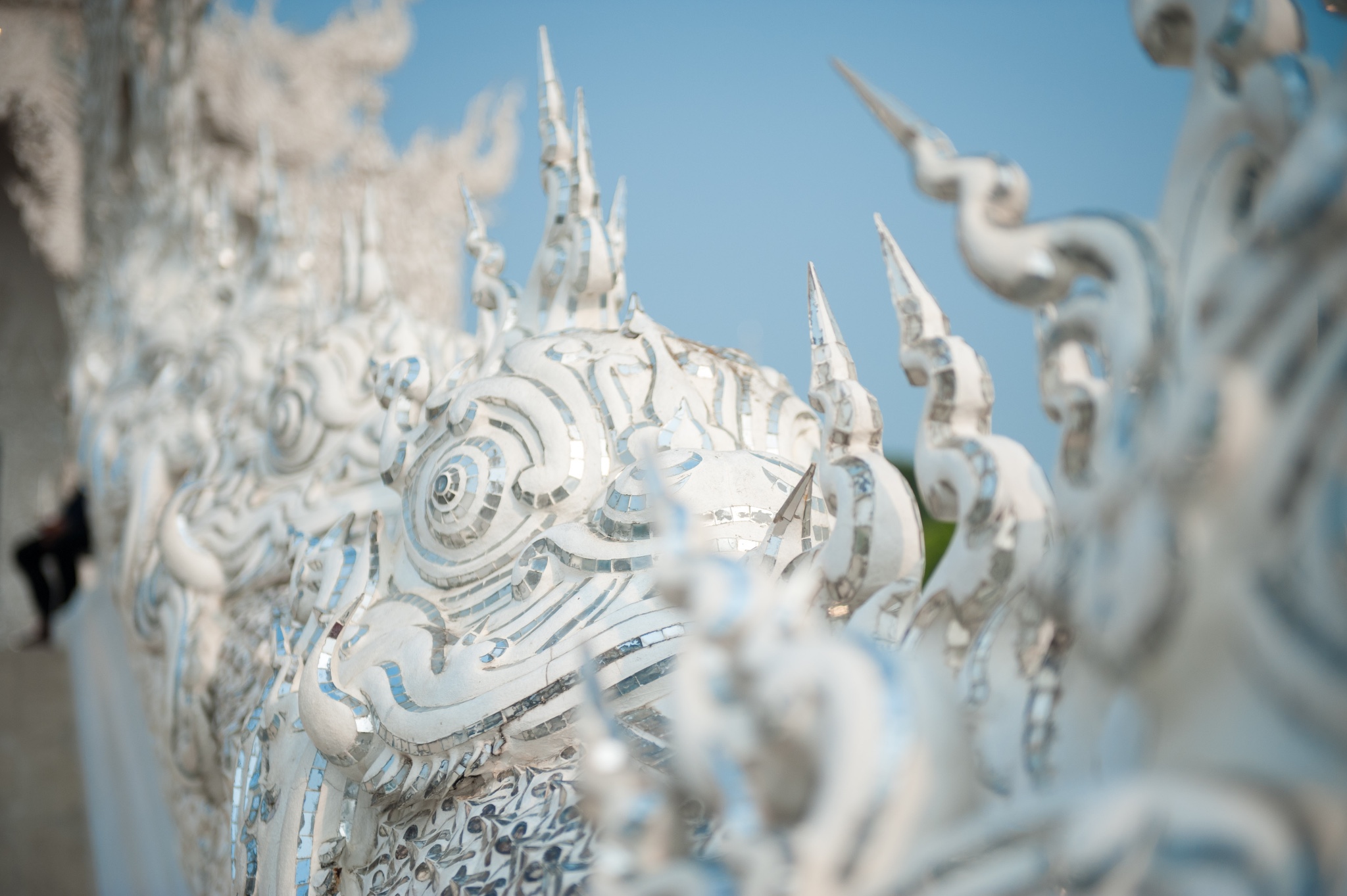 我们到了白庙的时候,那里还没开门,前面两张照片是从门口外面拍摄的,但门外也能看到白庙主建筑的整体。在门外的雪糕筒,都跟白面风格呼应,有这骷髅头☠️和白色的莲花塔。