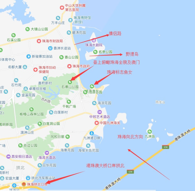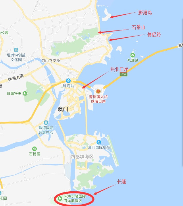 自己做了几张简易的图方便看个大概。可以看到长隆在珠海的南边靠近机场了,而市区的主要景点都集中在以拱北口岸为界北边的海岸线。