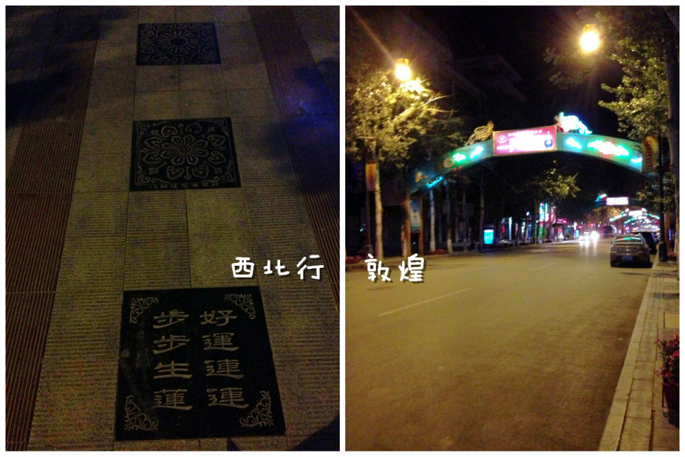 回去时是晚上10点多,街上人还挺多的,小孩子在嬉戏,老人们在树下乘凉,感觉就像平时8点多那样。敦煌 的两边道路很有特色,每隔几步路都有一图案