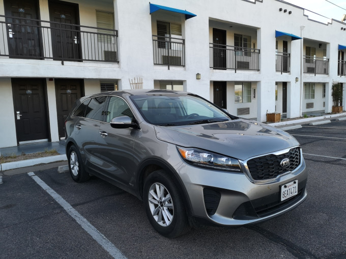 开始租车了,在图森机场有非常明确的指示,可以让我们很方便的找到租车公司。美国之所以被称为车轮上的国家,是因为美国算是全球公共交通比较不发达的国家之一,因为几乎每家每户都有车,而且有的还有好几辆。所以人家根本不需要去花费大量的人力物力资源去建设这些。但是,在美国的新车、二手车都非常的便宜,几乎是国内一半的价格;油费也超便宜,不管是排量大的皮卡还是普通的轿车,相比较国内而言,油钱花费较少。言归正传,上照片,看看这次要陪伴我们14天的伙伴 —— 起亚索兰托(Sorento)